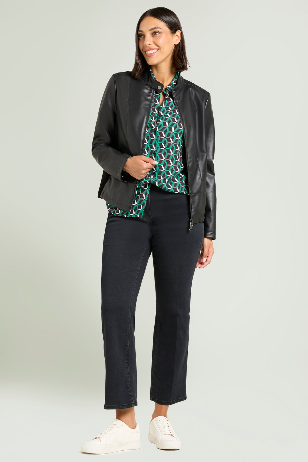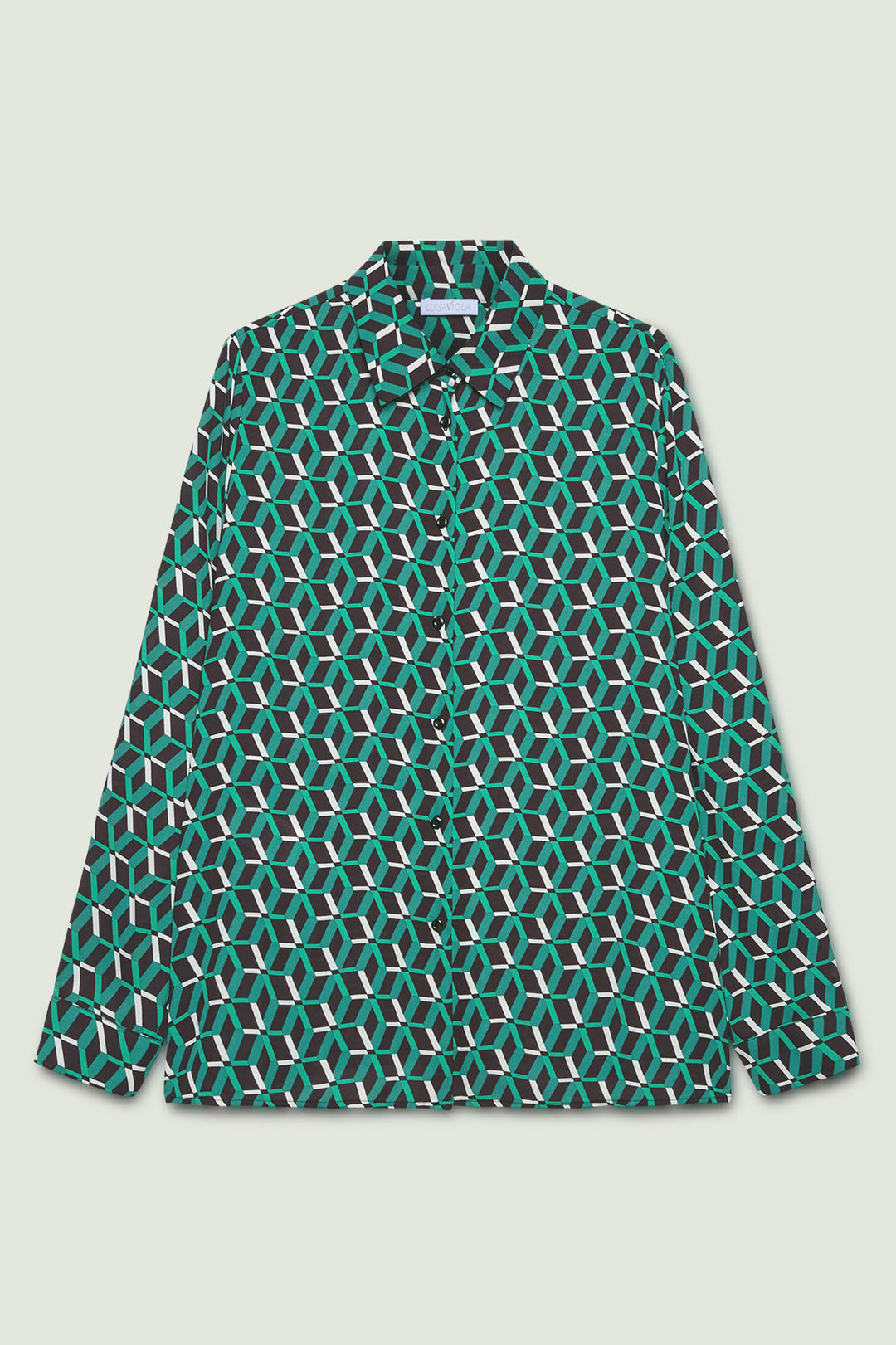 Camicia fantasia in doppia georgette. Linea dritta, colletto con listino, chiusura con bottoni, manica lunga con polso, dietro con carrè doppio e soffietto.