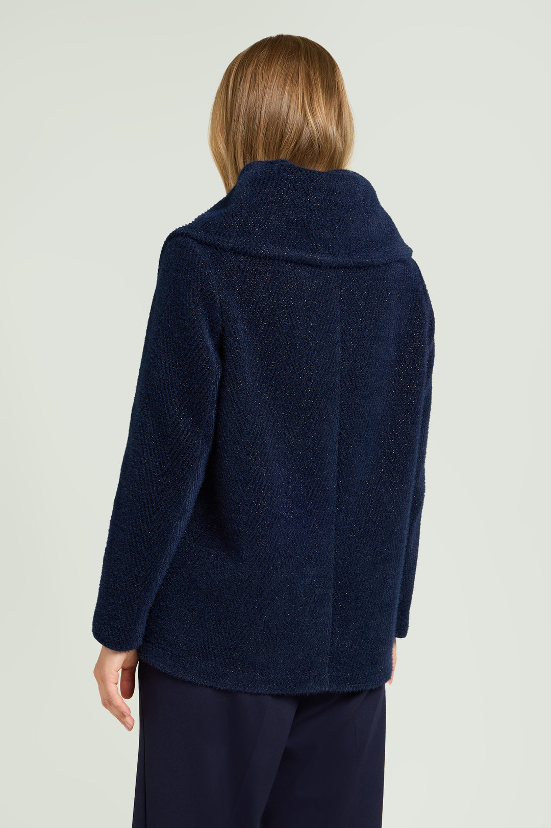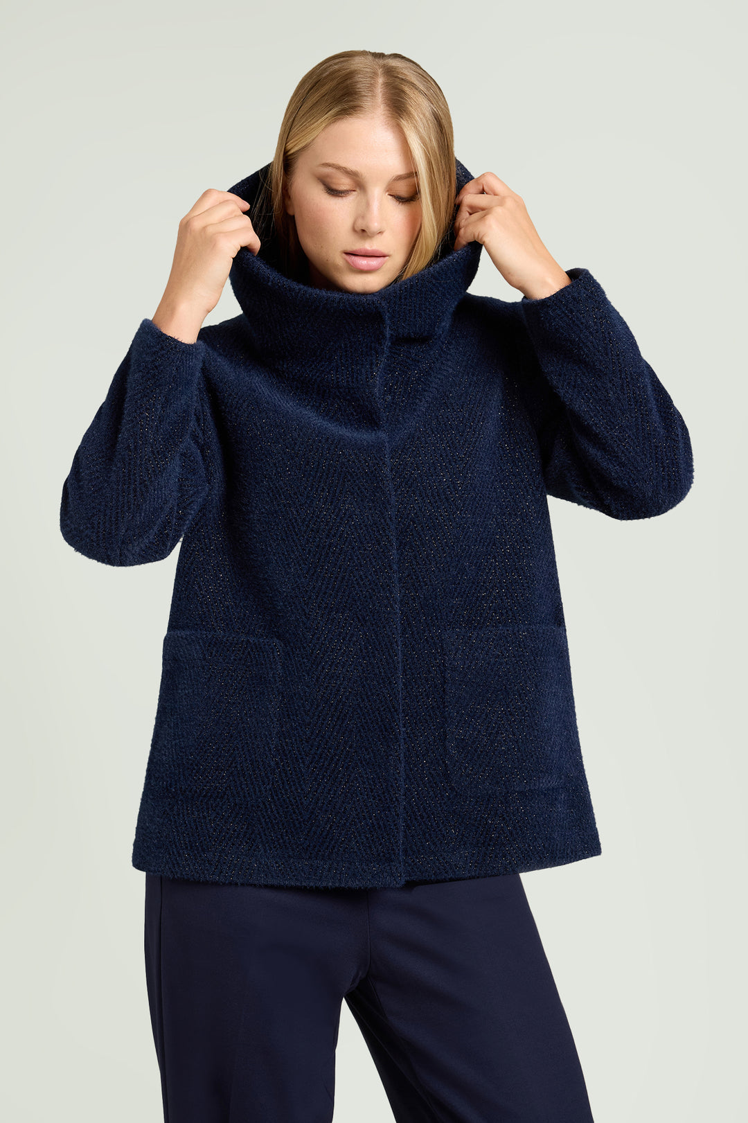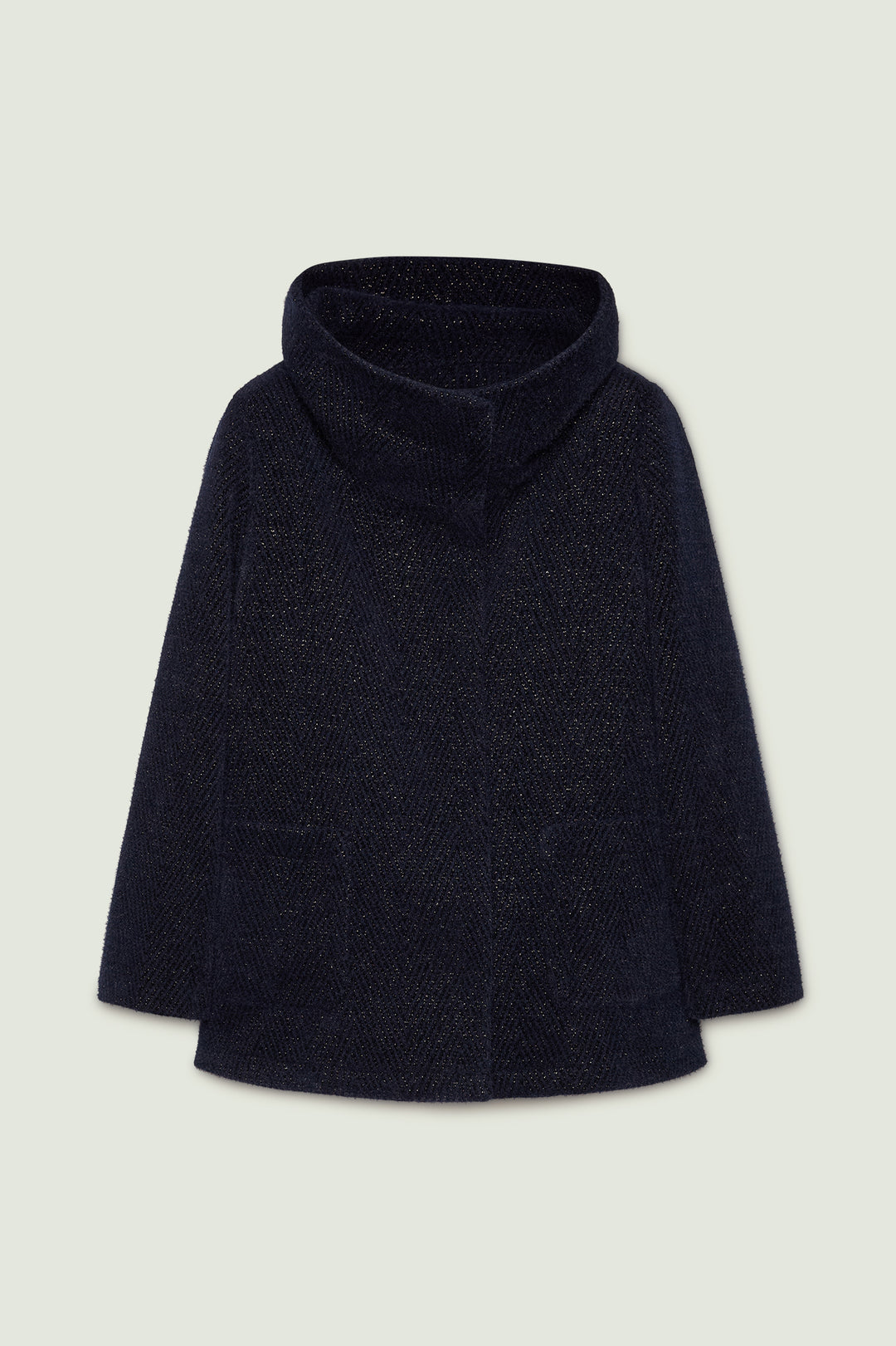 Morbido giaccone realizzato in un tessuto speciale: un'armatura chevron illuminata dall'intervento di un filo lurex che dona al capo un aspetto prezioso. Linea dritta, collo a corolla, chiusura con bottoni automatici nascosti, tasche applicate, foderato.