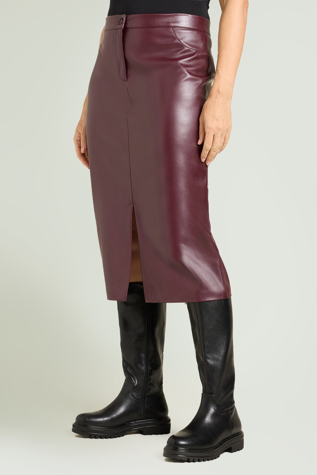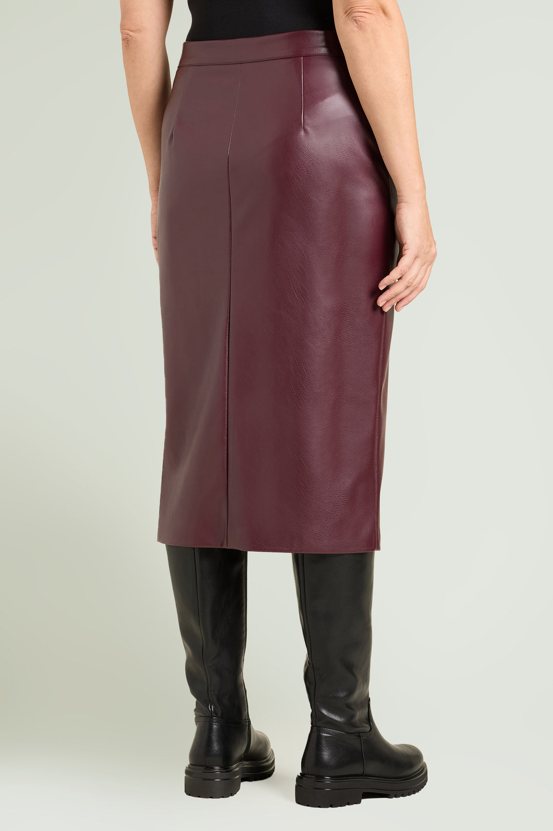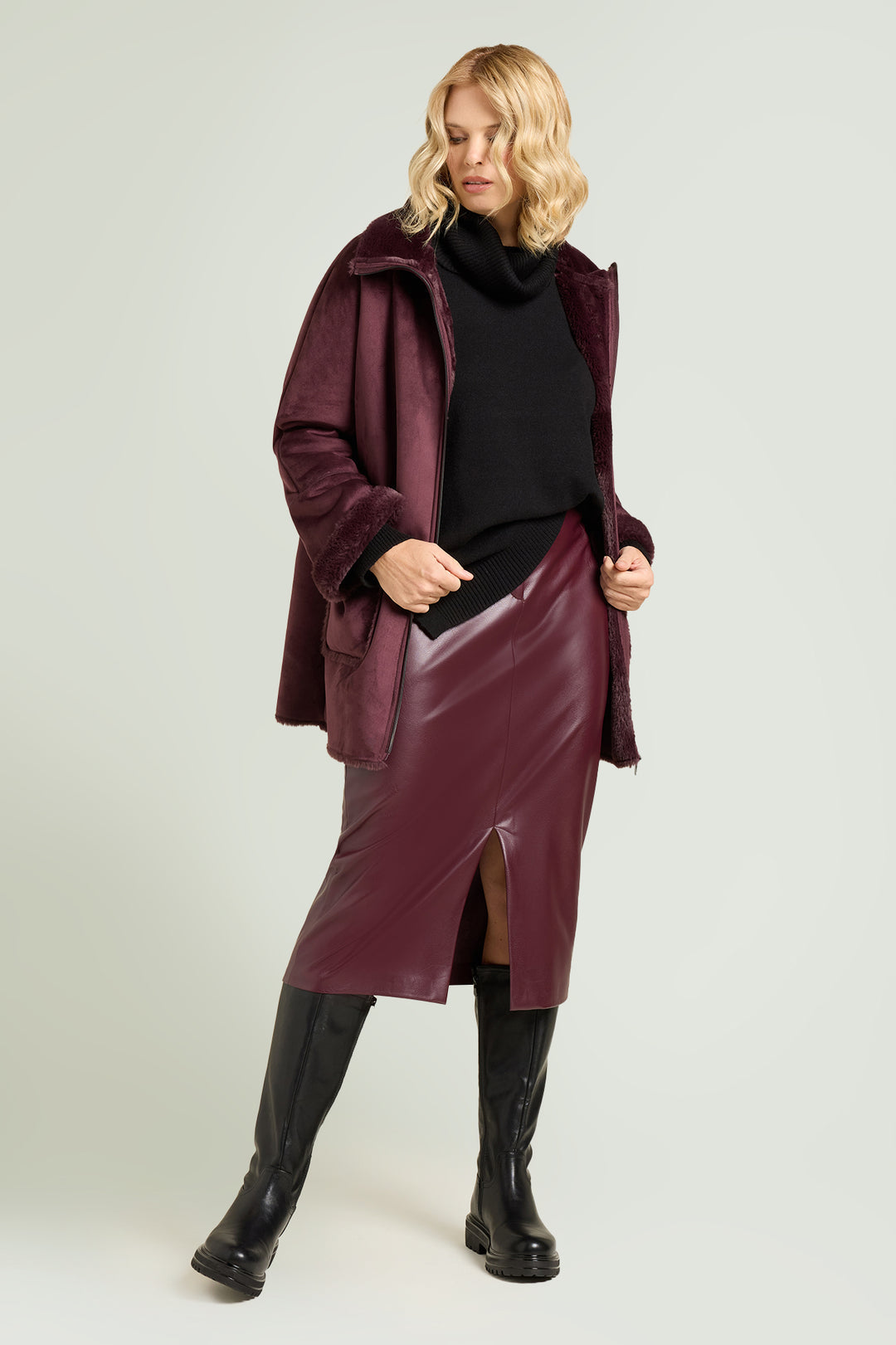 Gonna realizzata in un morbido tessuto spalmato con interno scamosciato. Linea dritta con spacco su centro davanti. Cinturino con lavorazione estensibile, chiusura davanti con zip nascosta e bottone, sfoderata.