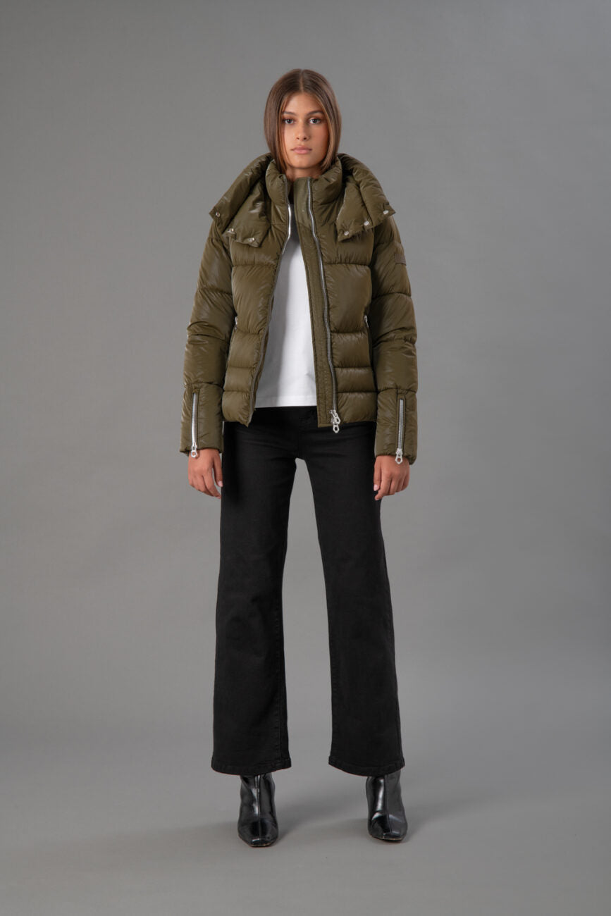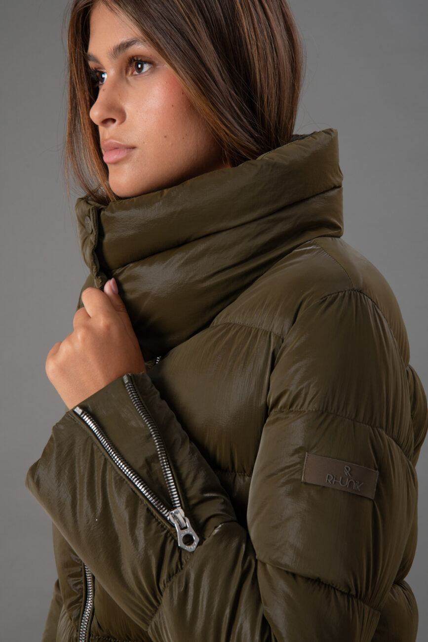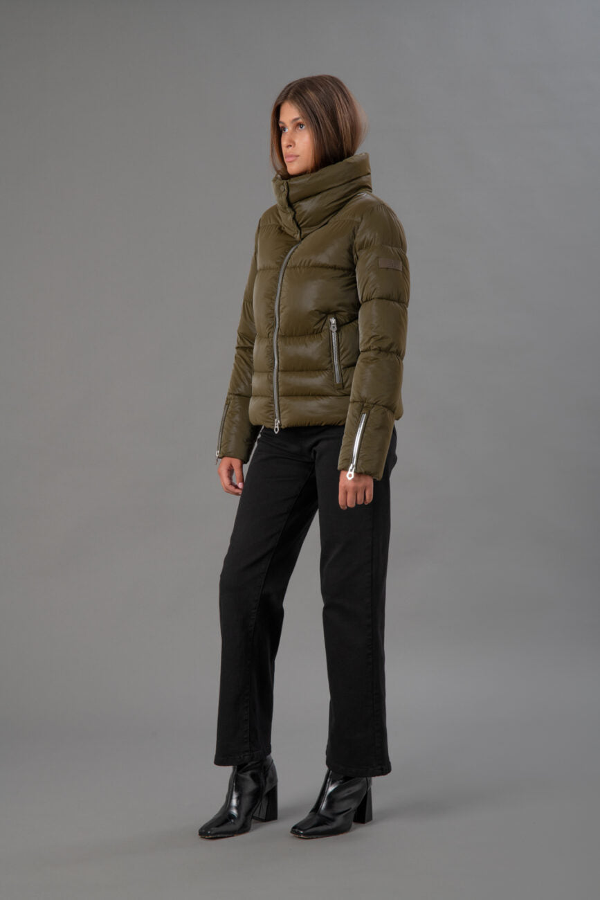 Giubbino corto realizzato in nylon metalizzato dall’effetto opalino. Doppio collo avvolgente, coulisse elastica che regola la vita dietro. Tasche laterali e fondo manica caratterizzati da zip tonali. Trapuntatura dallo sviluppo irregolare; imbottitura di peso invernale. Vestibilita’ regular, linea diritta.