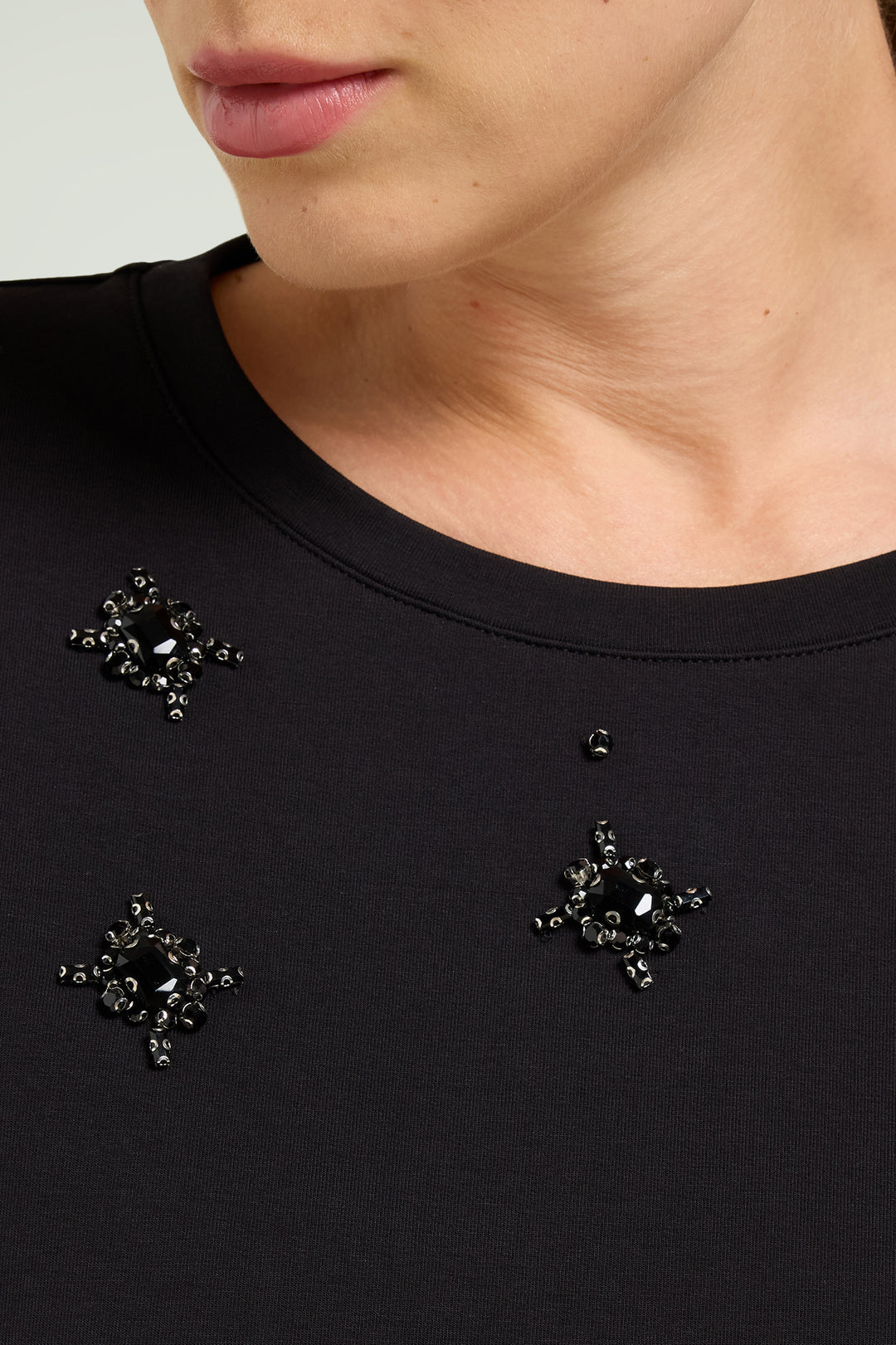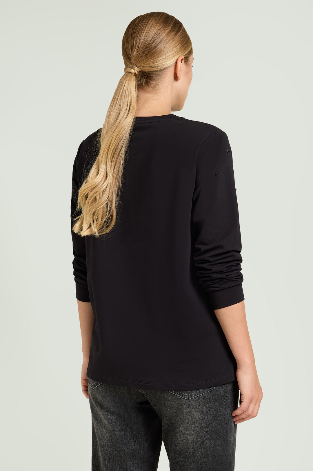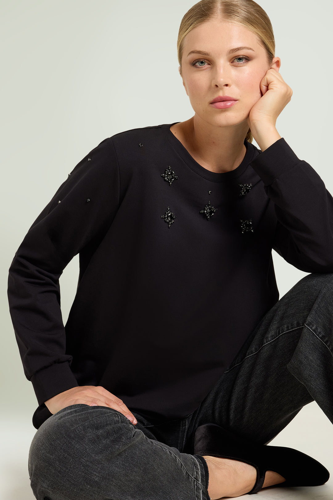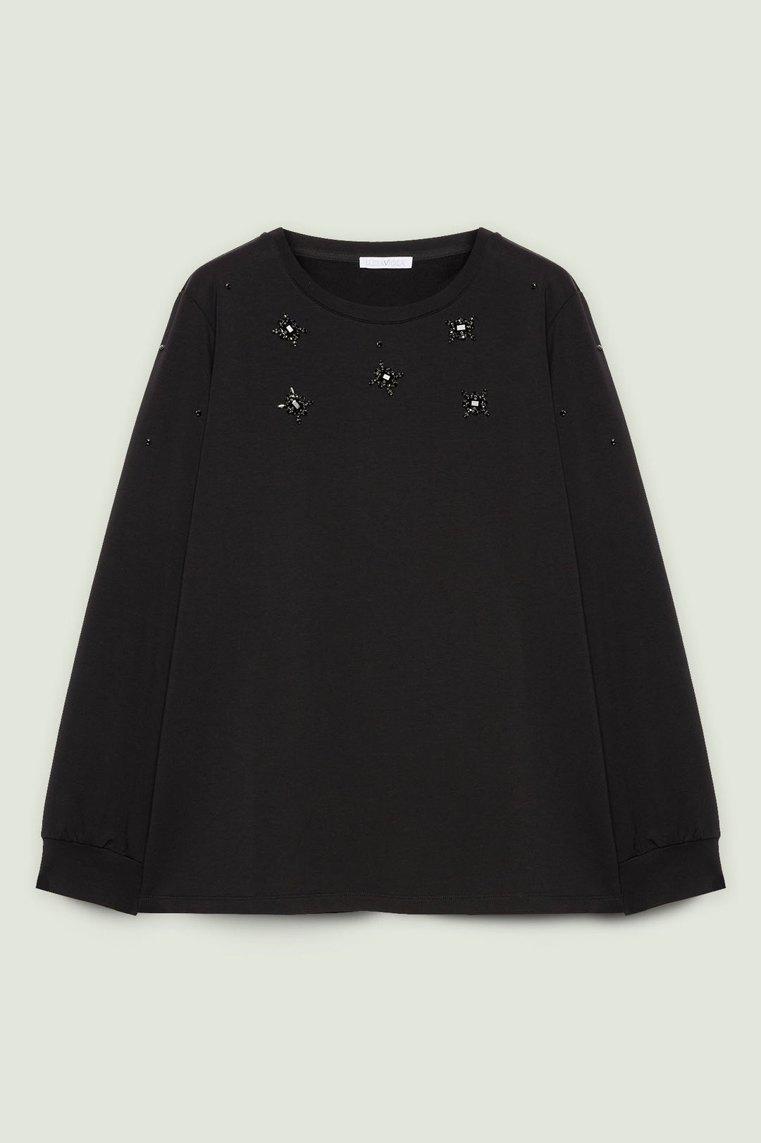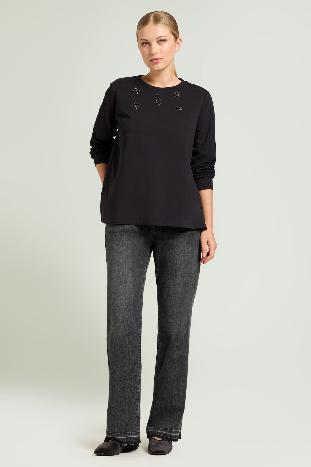 Felpa leggera di puro cotone stretch, caratterizzata da un prezioso ricamo. Linea boxy leggermente svasata con spacchi laterali, scollatura rotonda, maniche lunghe con polso.