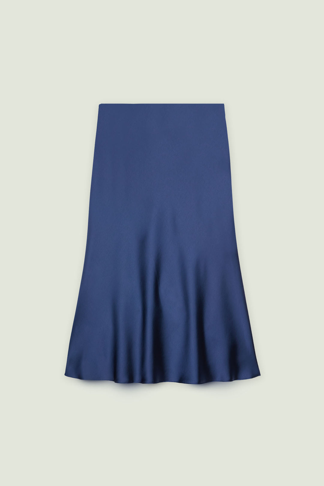 Gonna con taglio in sbieco realizzata in un corposo satin dalla caduta fluida. Punto vita estensibile con elastico inserito all'interno.