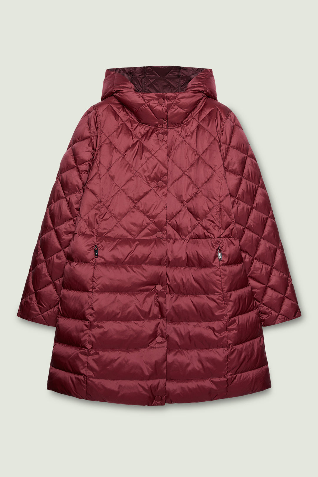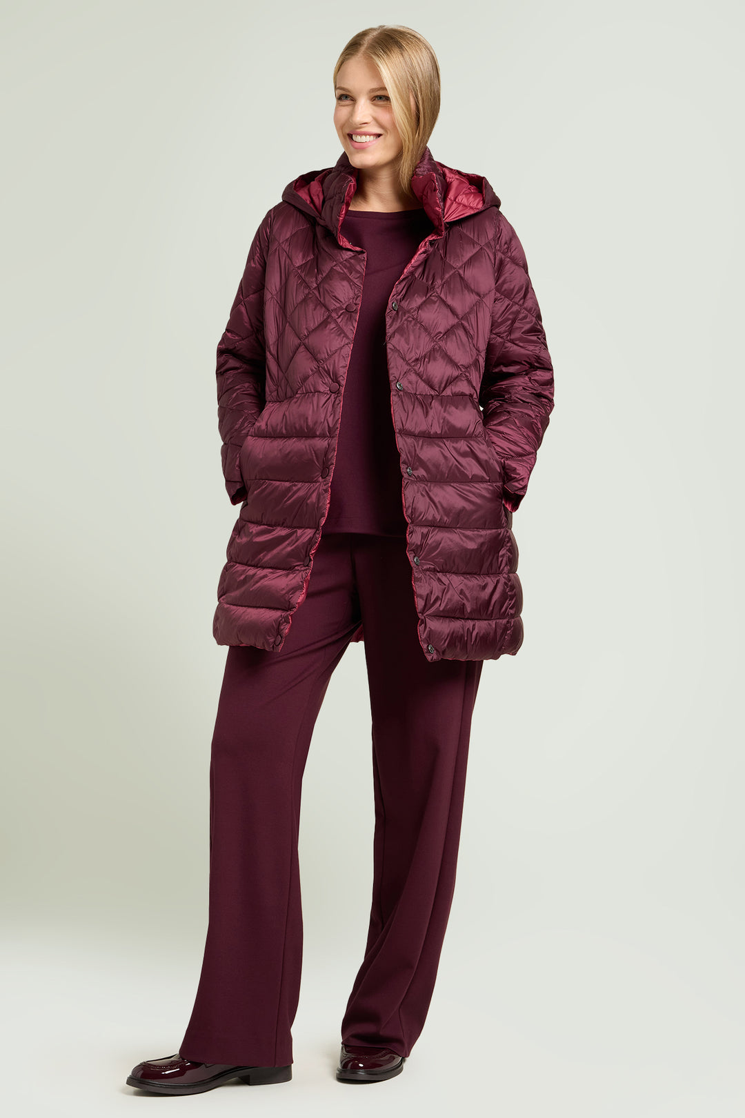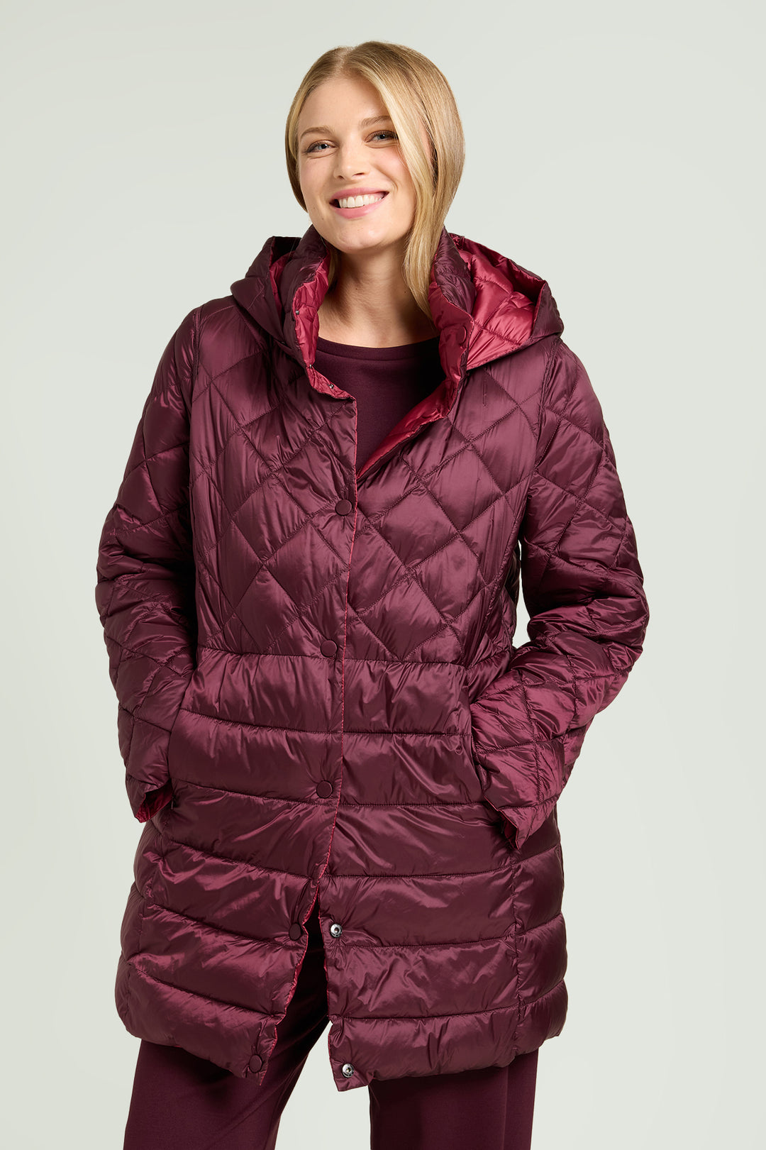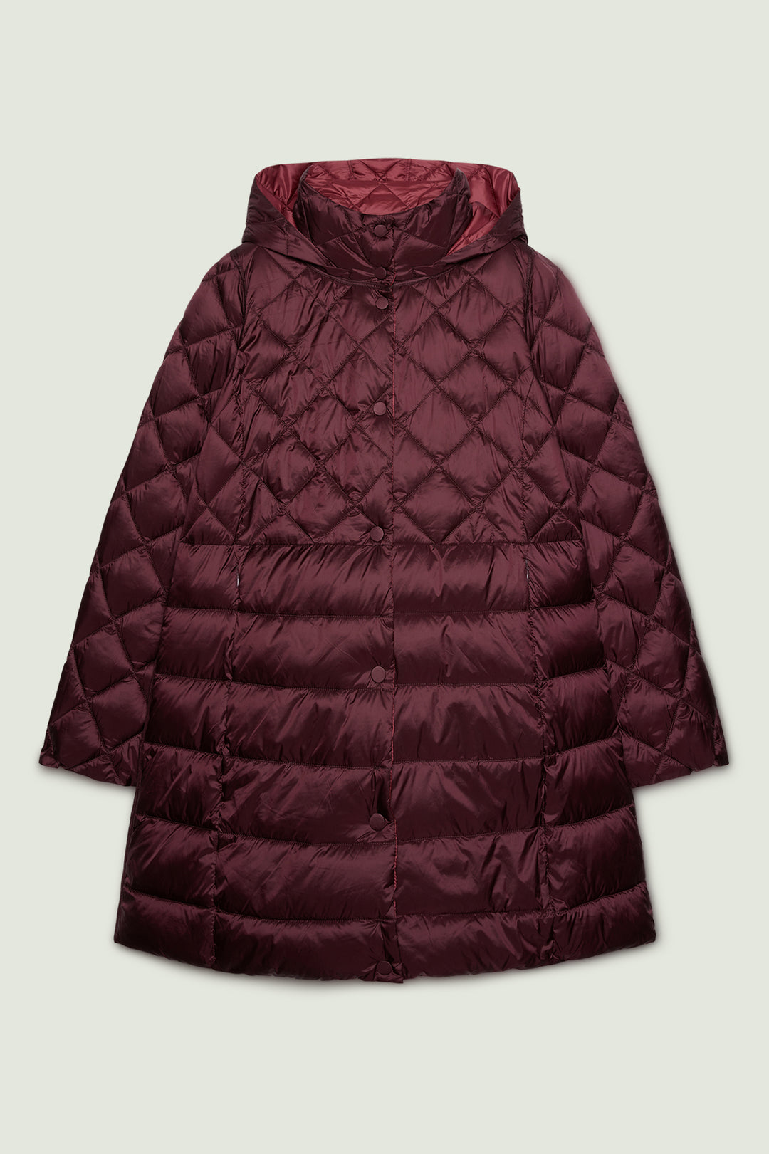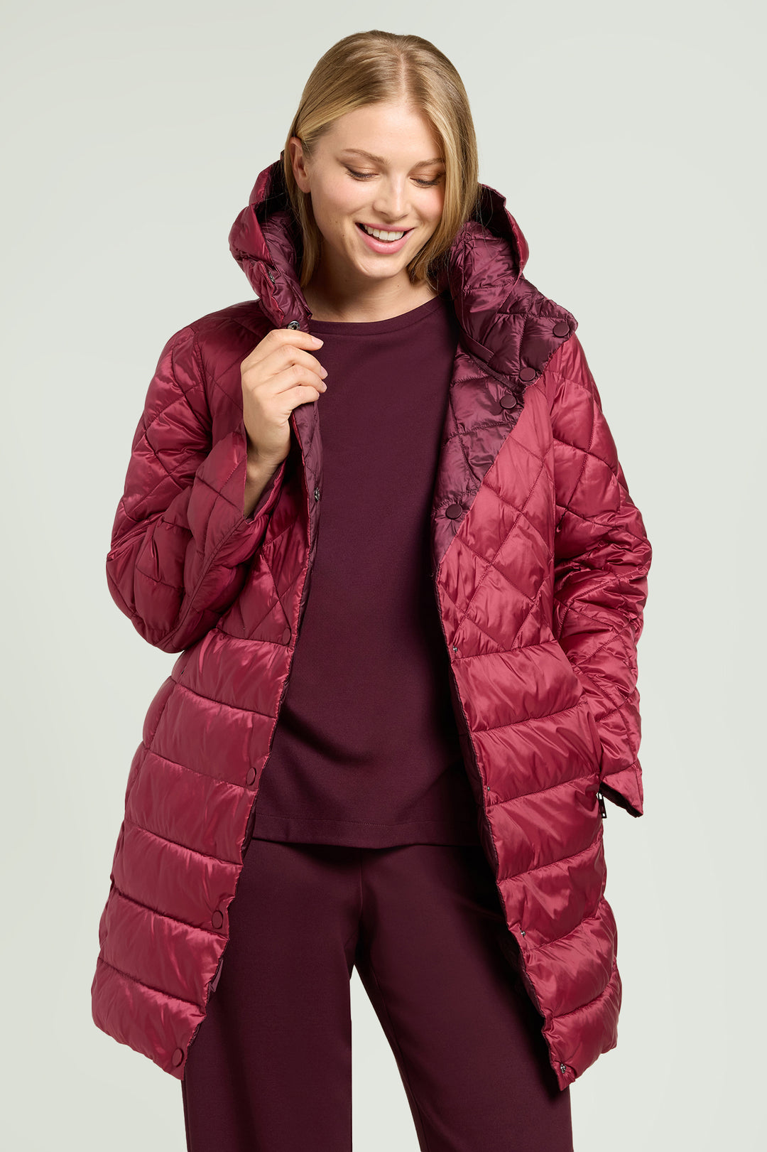 Piumino reversibile in nylon cangiante di lunghezza media, dalla linea leggermente sciancrata. Collo a listino con cappuccio staccabile, chiusura con bottoni foderati in tessuto, tasche a scomparsa chiuse da zip. Imbottitura in fake down.