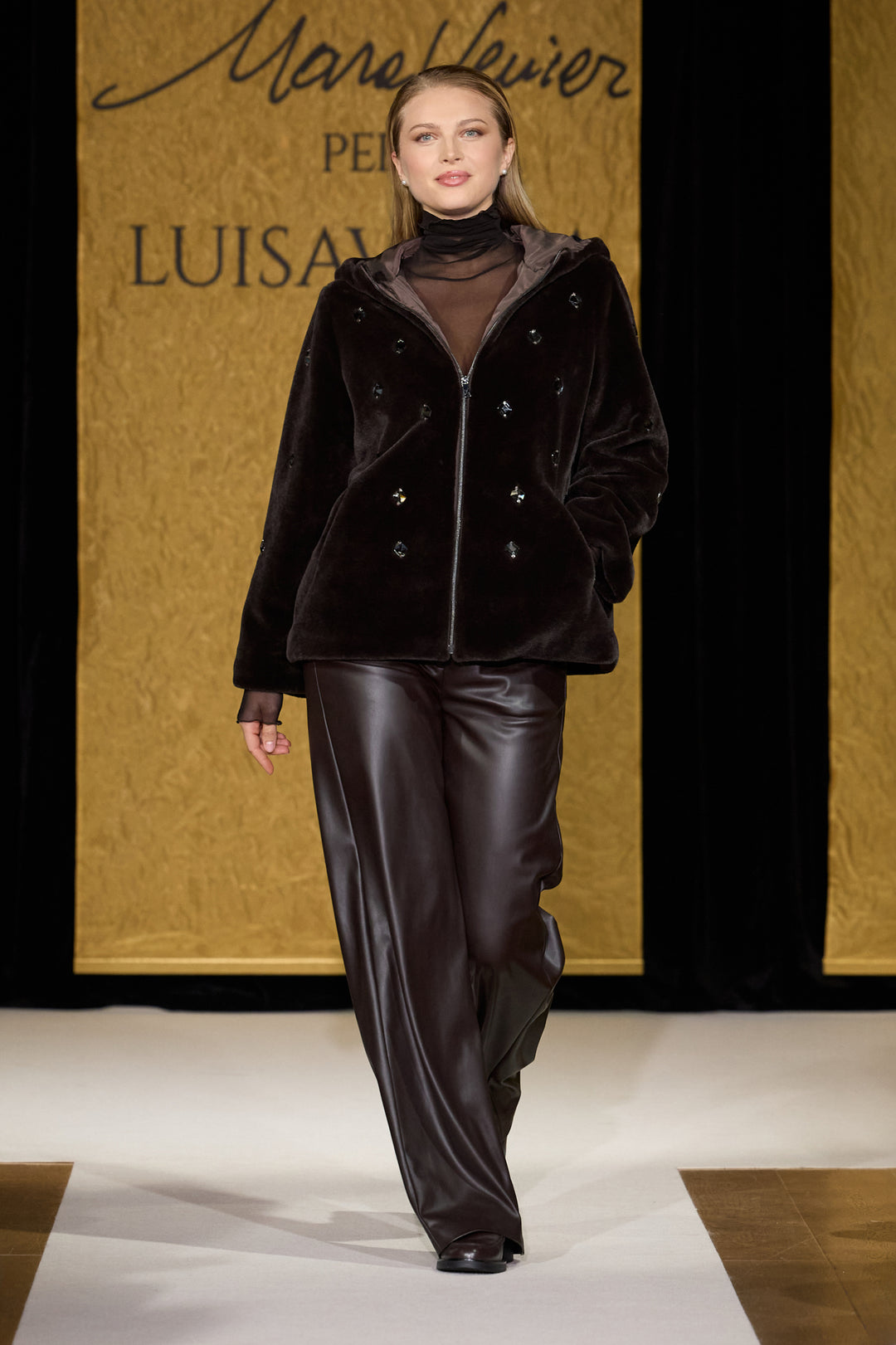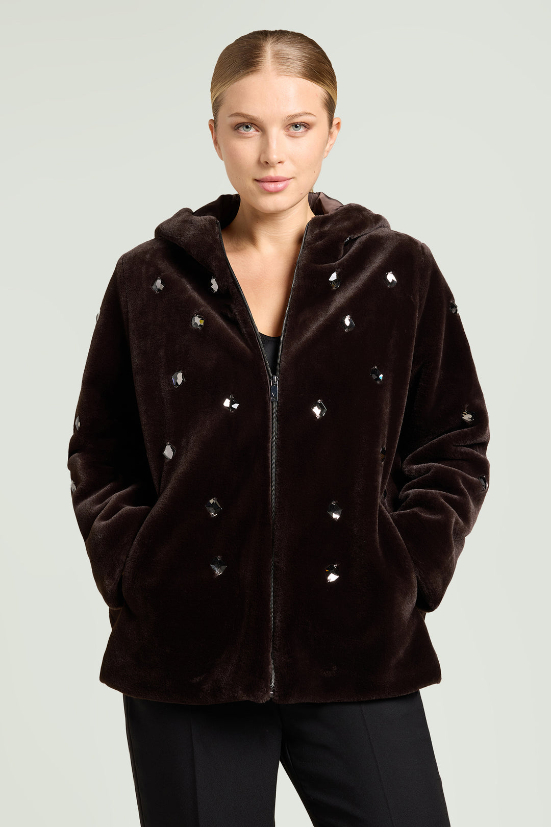 Giaccone con cappuccio realizzato in un piacevole tessuto soft-touch, caratterizzato da una pioggia di castoni in vetro fumè applicati a mano. Chiusura con zip, tasche a fessura. Foderato