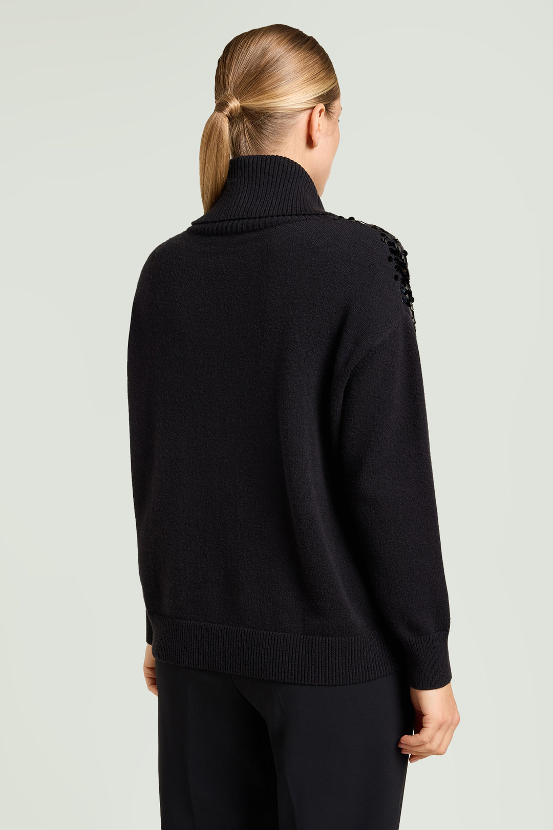 Maglia realizzata in un confortevole filato winter touch. Punto rasato in finezza 7 con bordi in costa, scollo a barchetta con collo ad anello. Ricamata con maxi-paillettes in tinta.