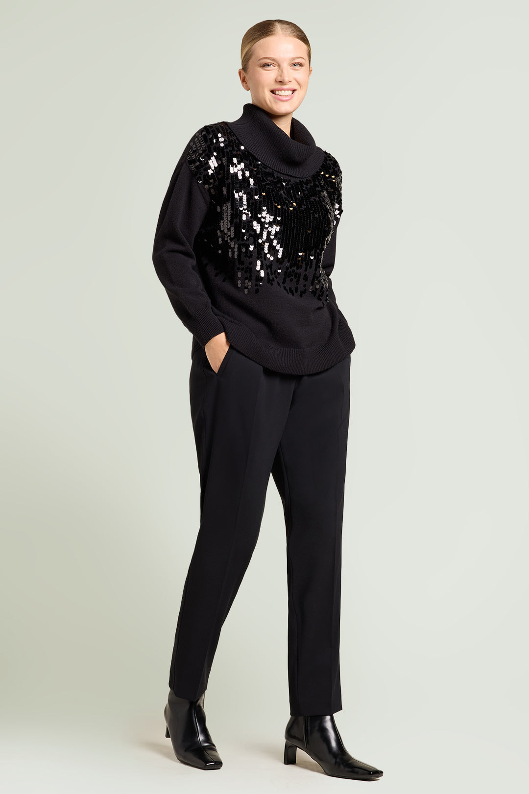 Maglia realizzata in un confortevole filato winter touch. Punto rasato in finezza 7 con bordi in costa con collo ad anello. Ricamata con maxi-paillettes in tinta.
