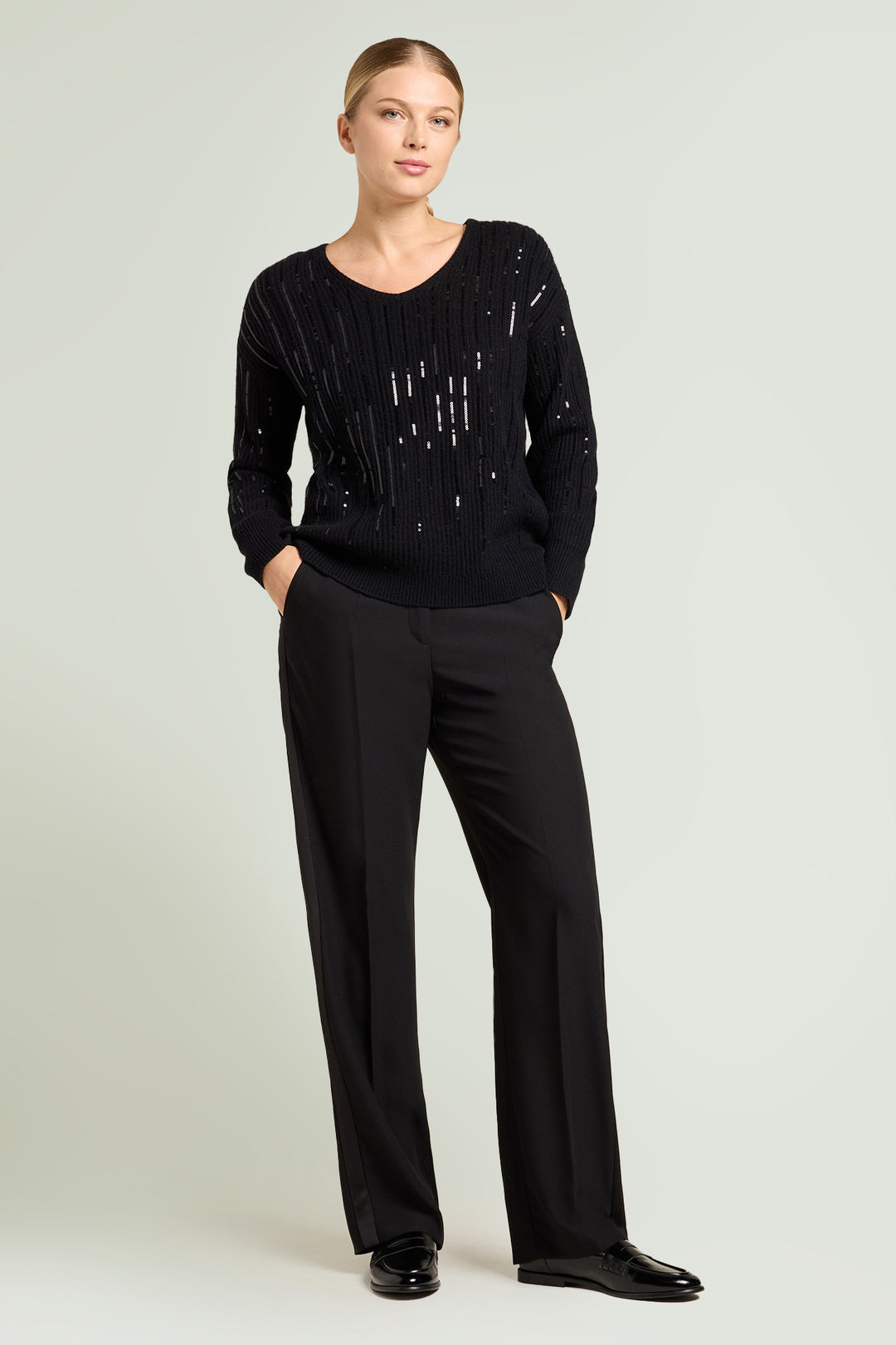Soffice maglia in filato mistocashemire, caratterizzata da un ricamo degradè di paillettes. Punto con coste piatte in finezza 7, scollo a "V". Disponibile nera con paillettes in tinta e avorio con paillettes dorate.