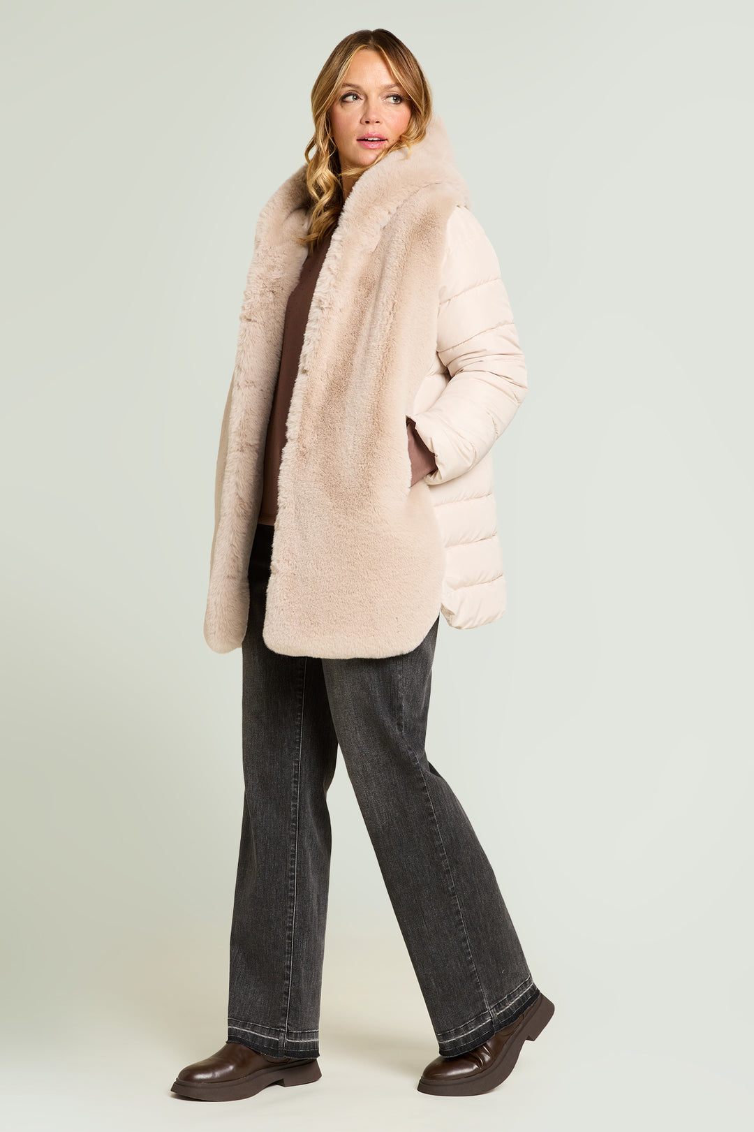 Piumino bimaterico dalla linea leggermente svasata: davanti e cappuccio in tessuto a pelo lungo, maniche e dietro in nylon trapuntato con imbottitura fake down. Chiusura con gancetti, tasche a fessura.