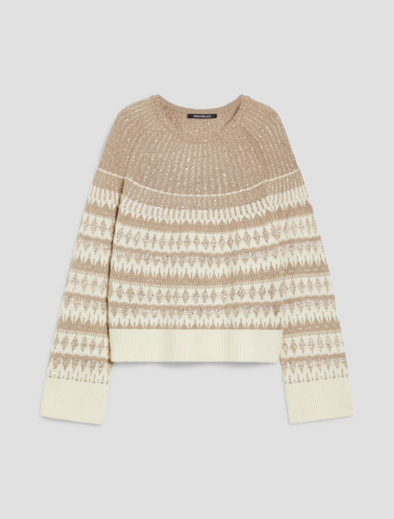 La maglia jacquard a motivi geometrici ha tutto il fascino del tricot nordico – e un tocco in più: arricchita da riflessi scintillanti, accenderà ogni look.