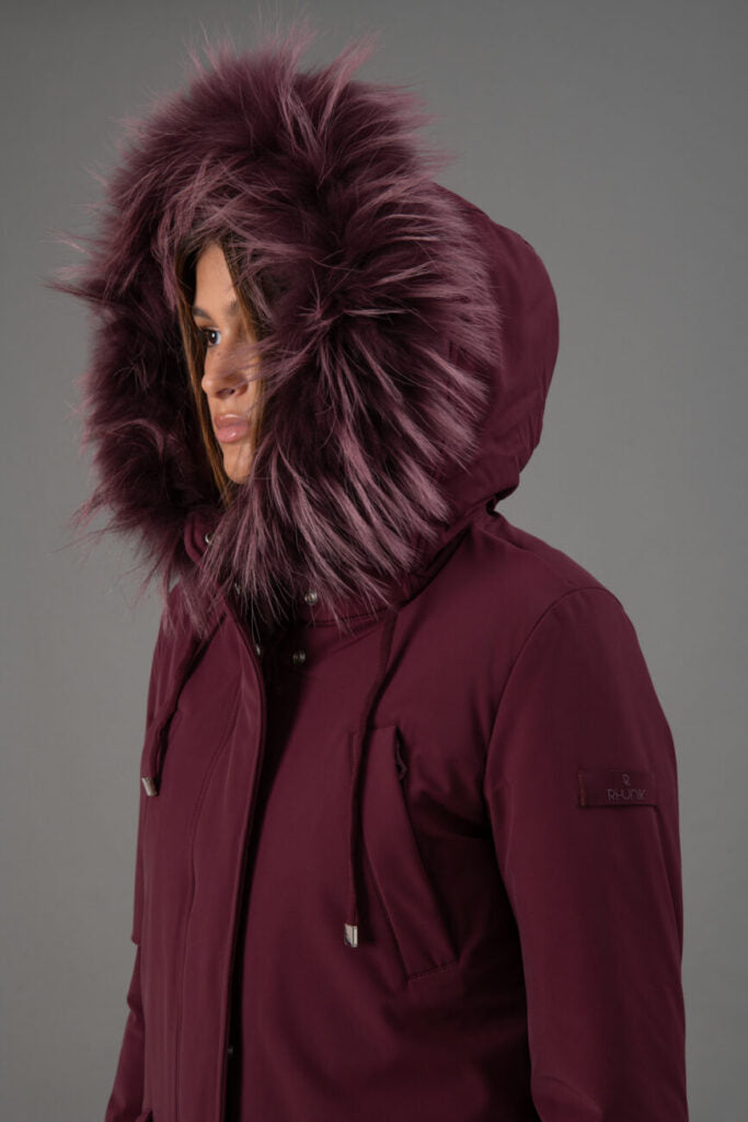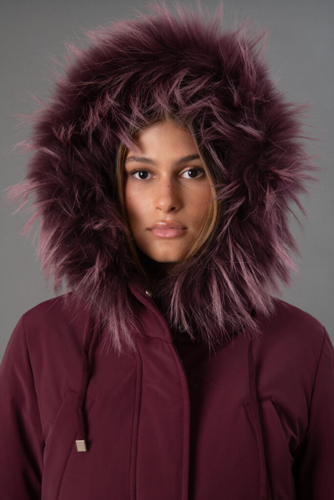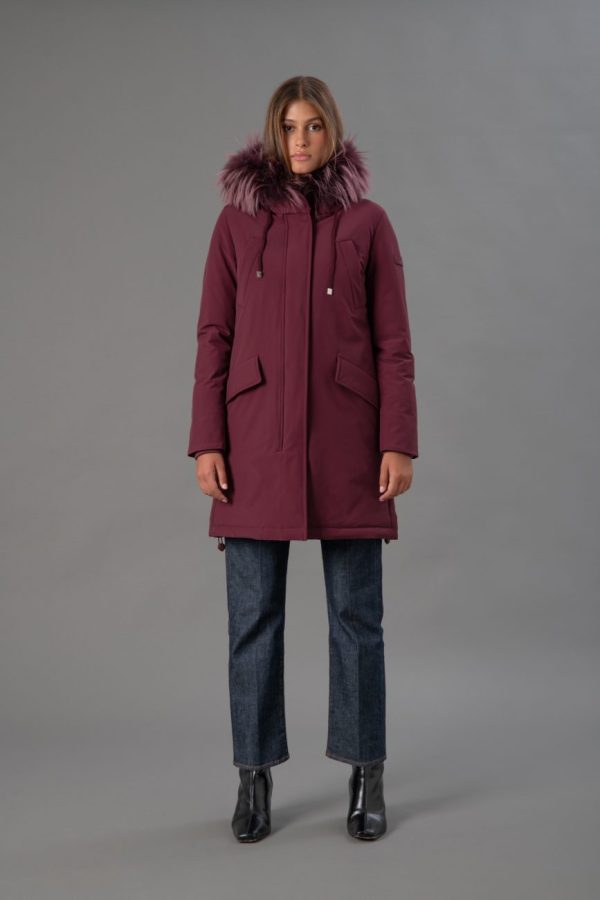 Capospalla con cappuccio, bordato da pelliccia naturale staccabile, dal concept “parka” realizzato in nylon stretch opaco accoppiato. La schiena è caratterizzata da un inserto di nylon cangiante imbottito e trapuntato con disegno rombo. Zip sui fianchi, e polso interno in costina. Vestibilità comfort, linea diritta e lunghezza a tre quarti.