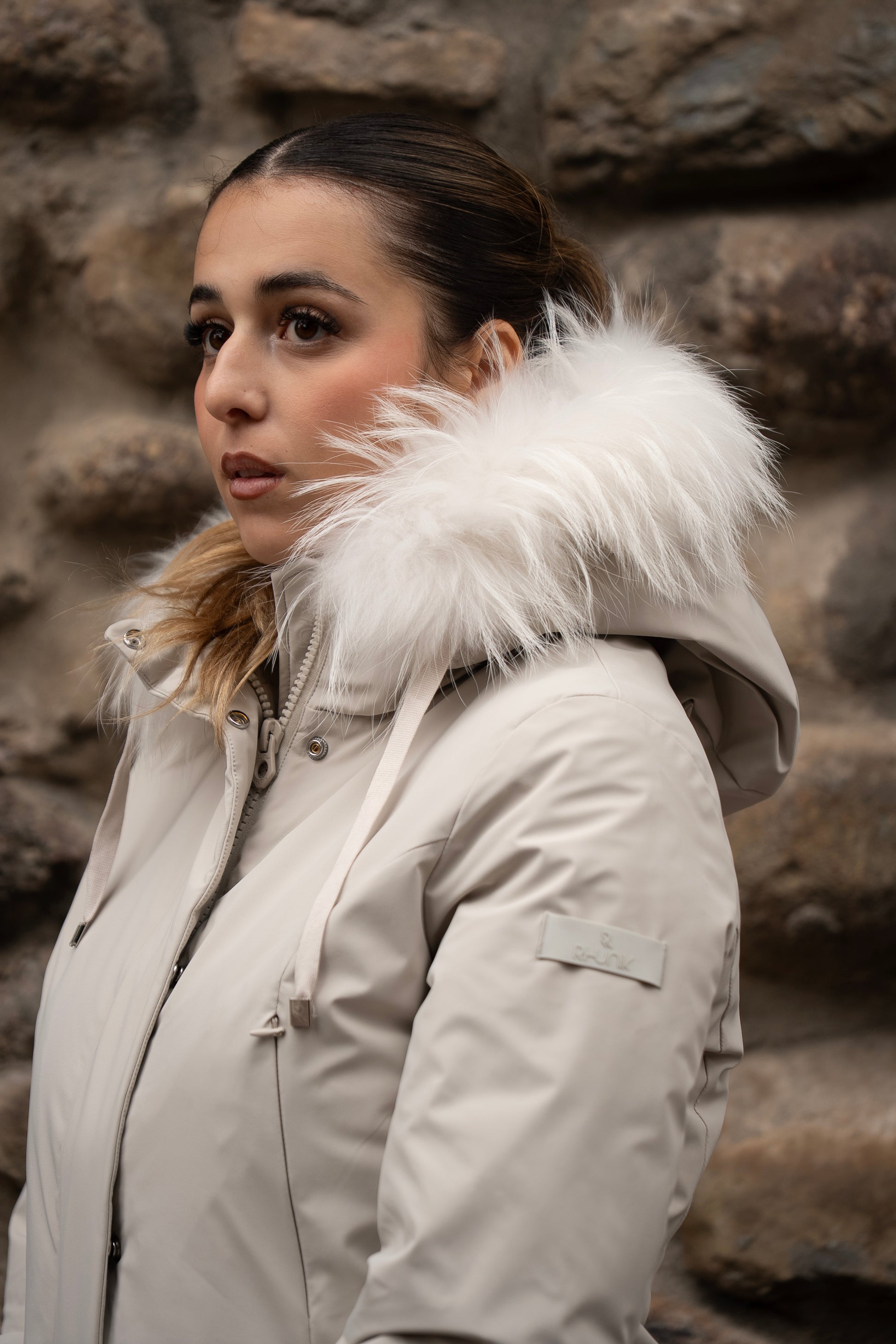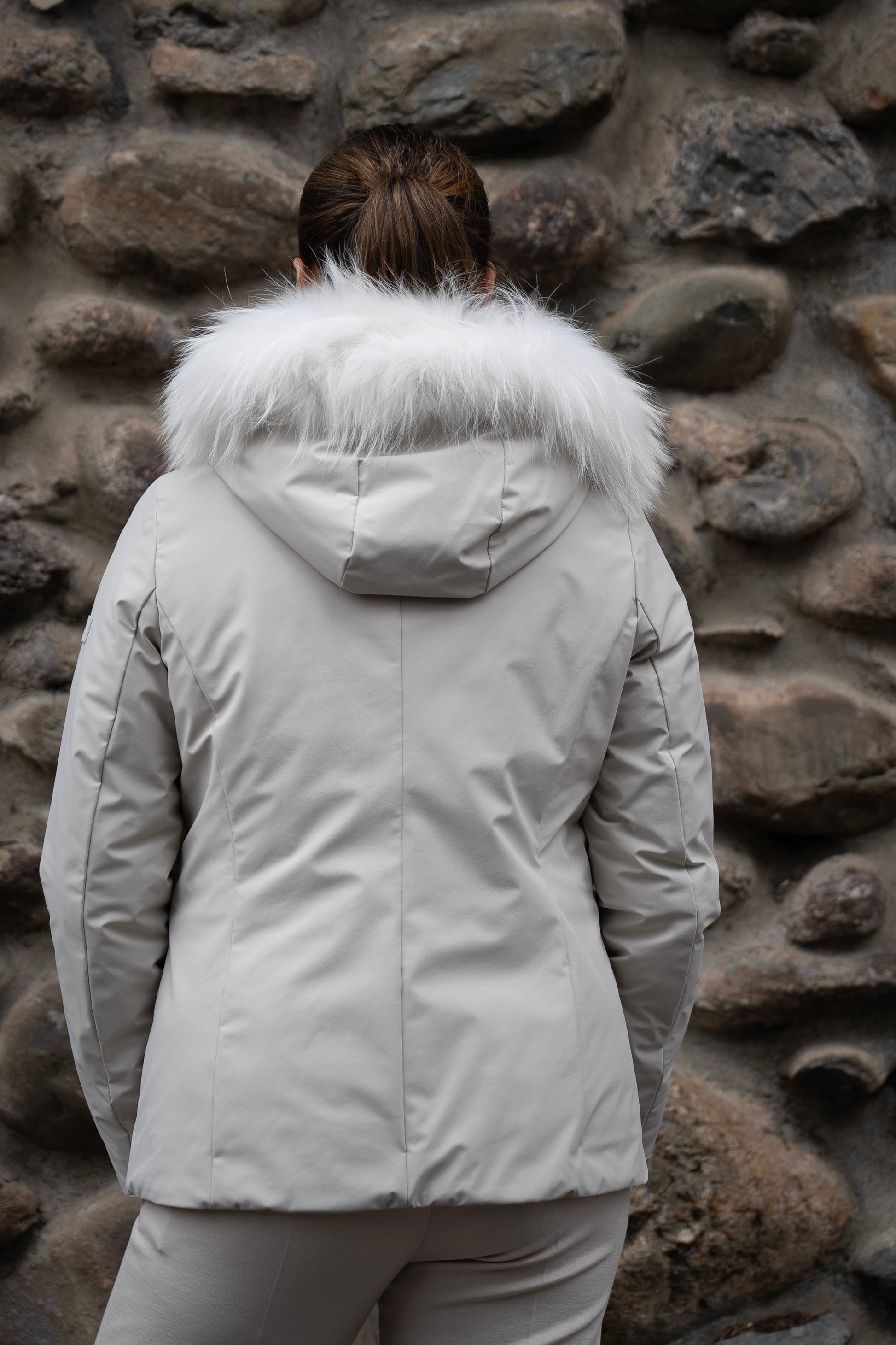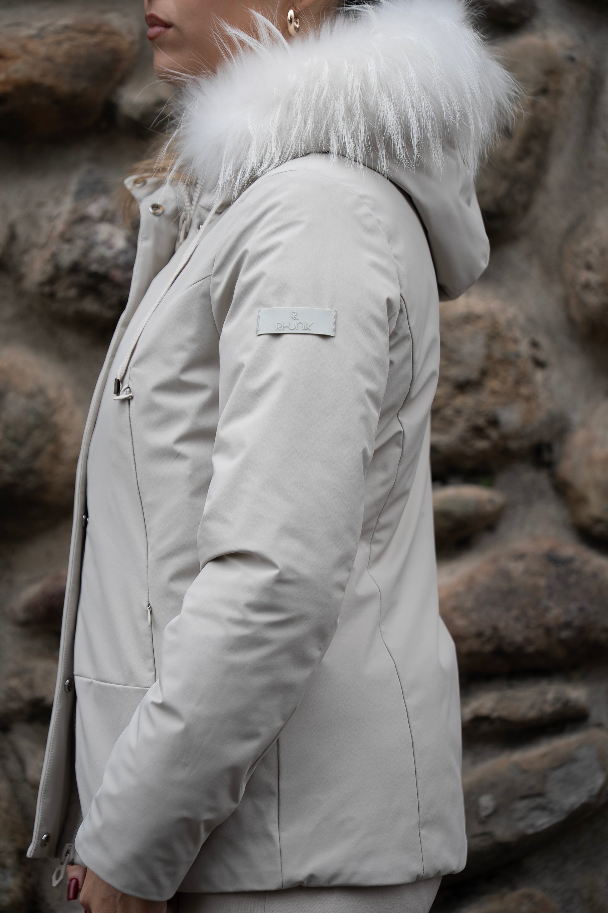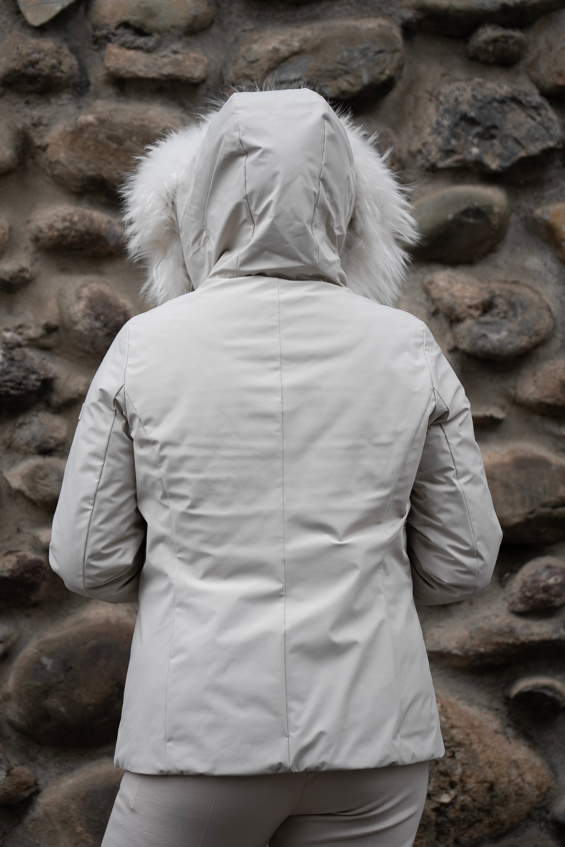 Giubbino liscio realizzato in nylon stretch opaco accoppiato. Cappuccio bordato con pelliccia naturale staccabile, fondo manica chiuso con polso interno in costina. Le 4 tasche con zip invisibili lo distinguono per la sua immagine pulita. Vestibilità asciutta.
