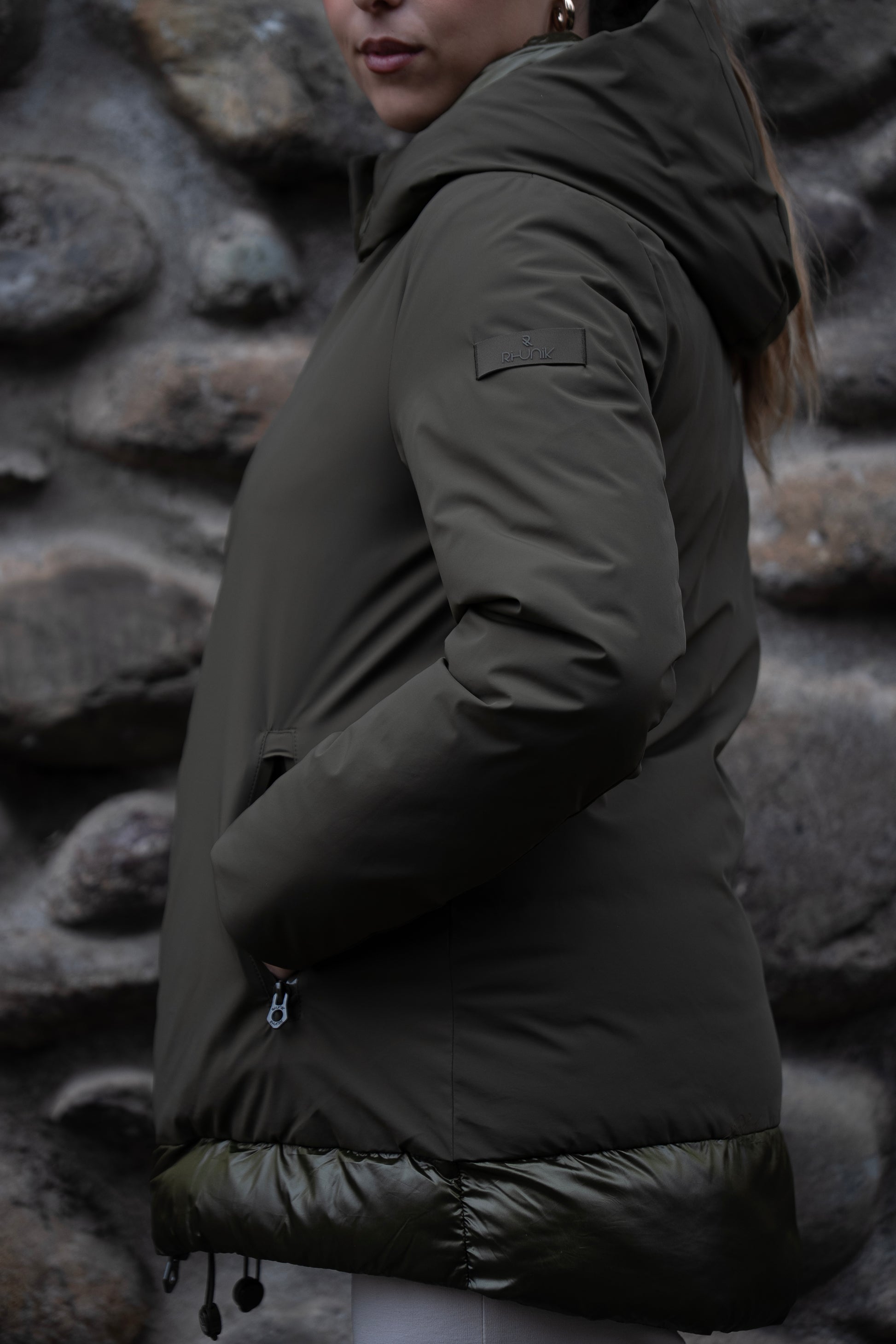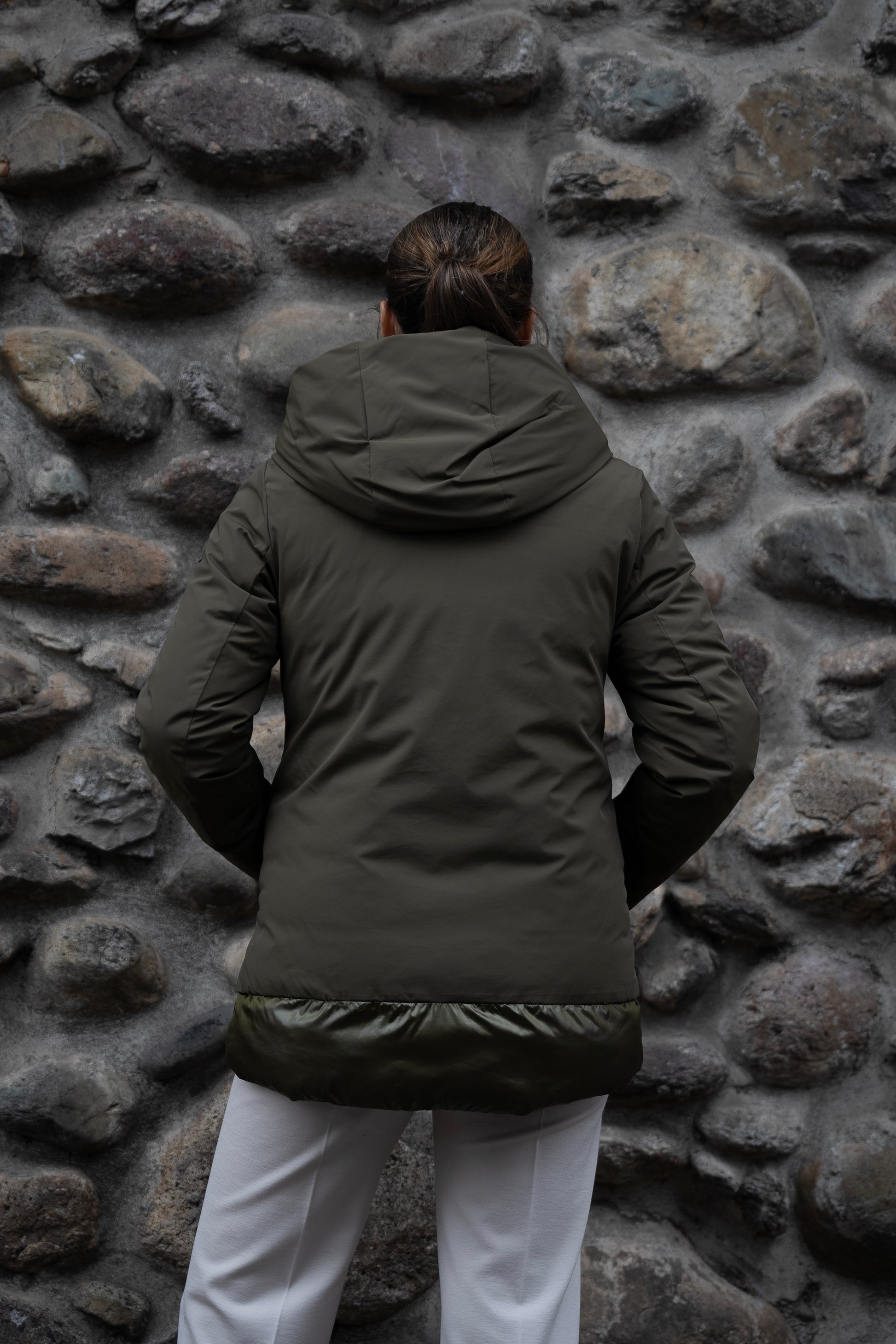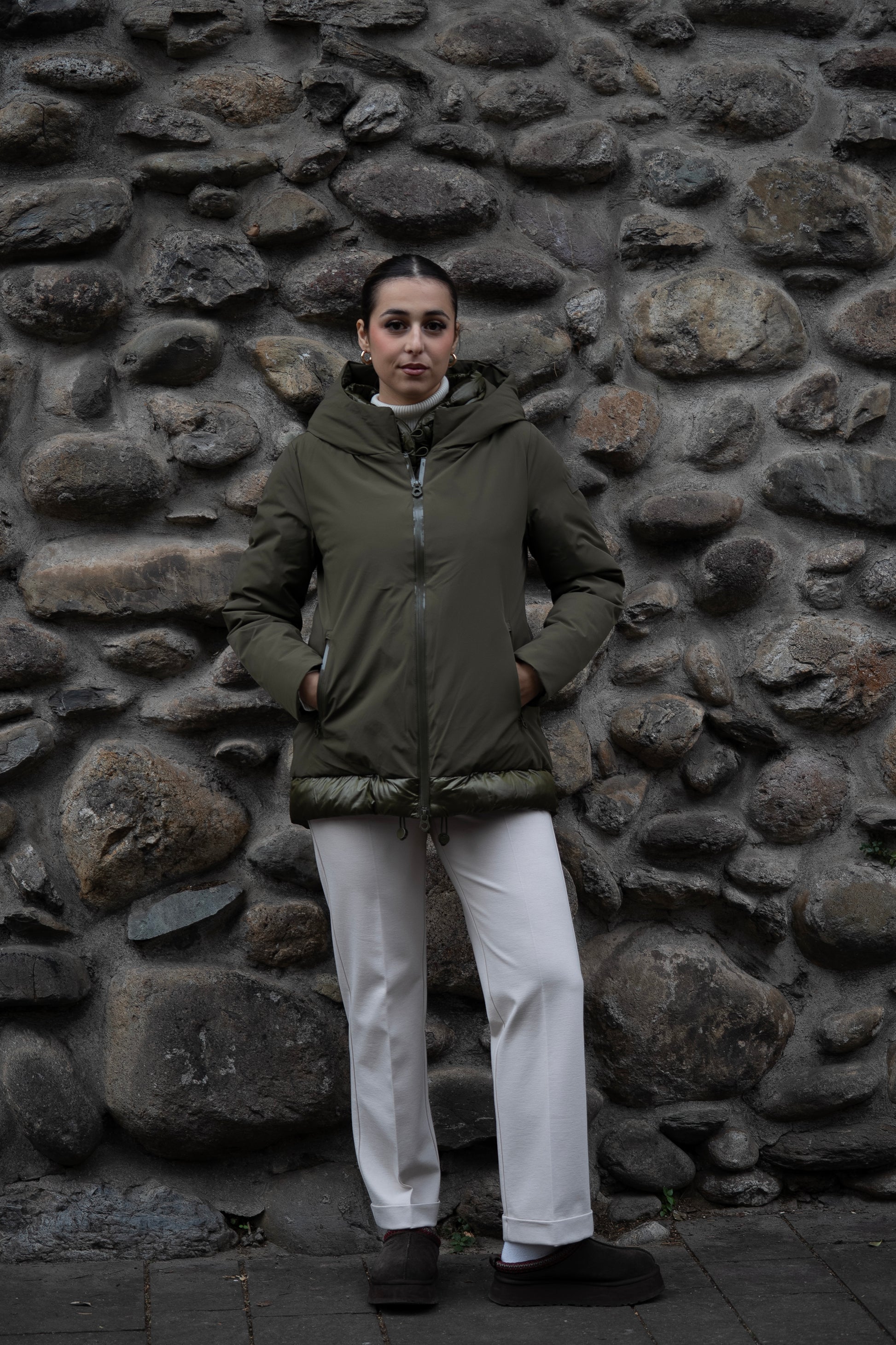 Giubbino liscio dal concept informale realizzato in nylon stretch opaco con dettagli di nylon ultra leggero lucido. Cappuccio avvolgente con collo integrato, zip idrorepellenti per chiusura frontale e tasche. Fondo manica con polso interno in costina. Dietro arrotondato più lungo del davanti. vestibilità regular, linea ad “A”.