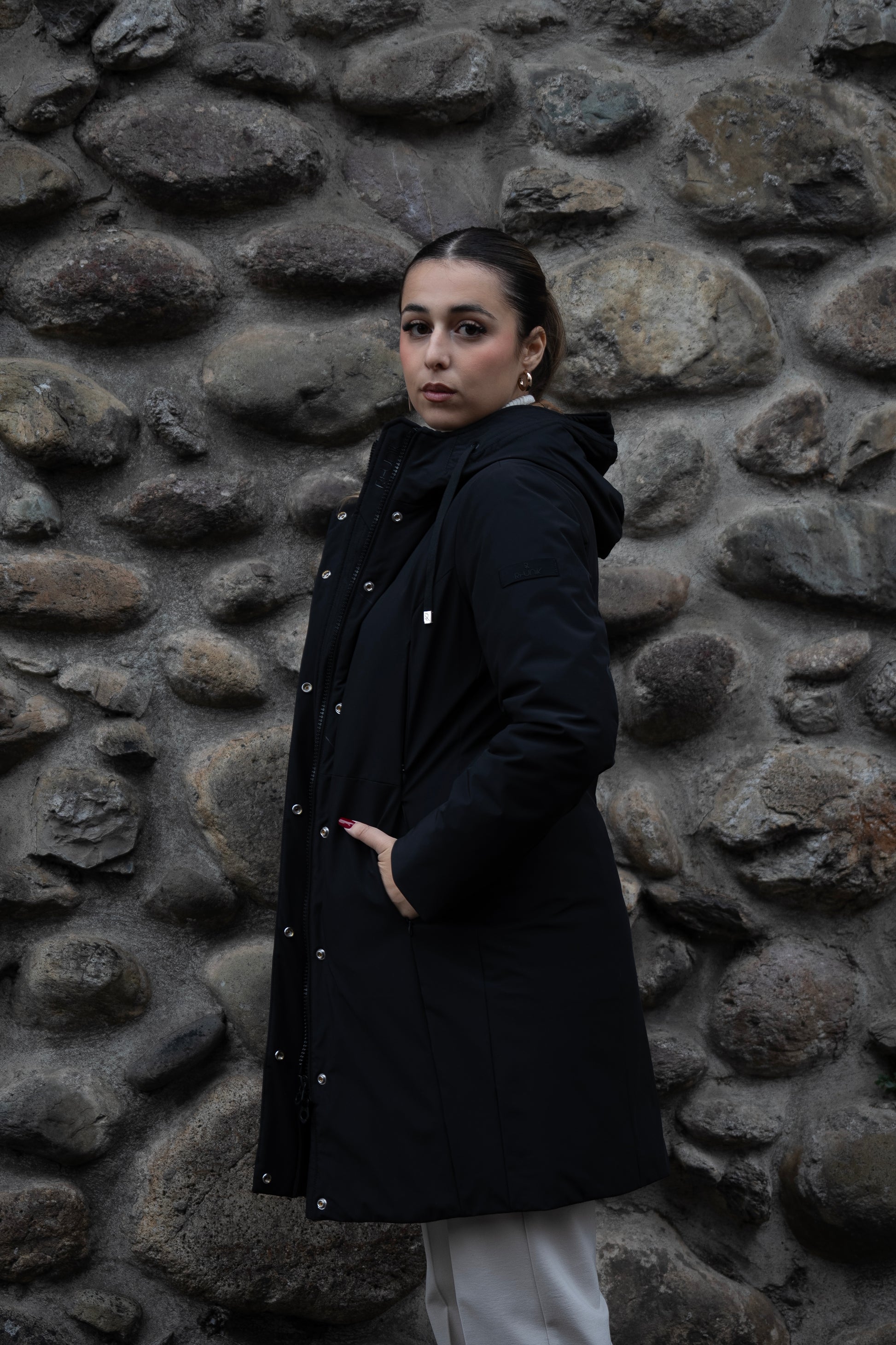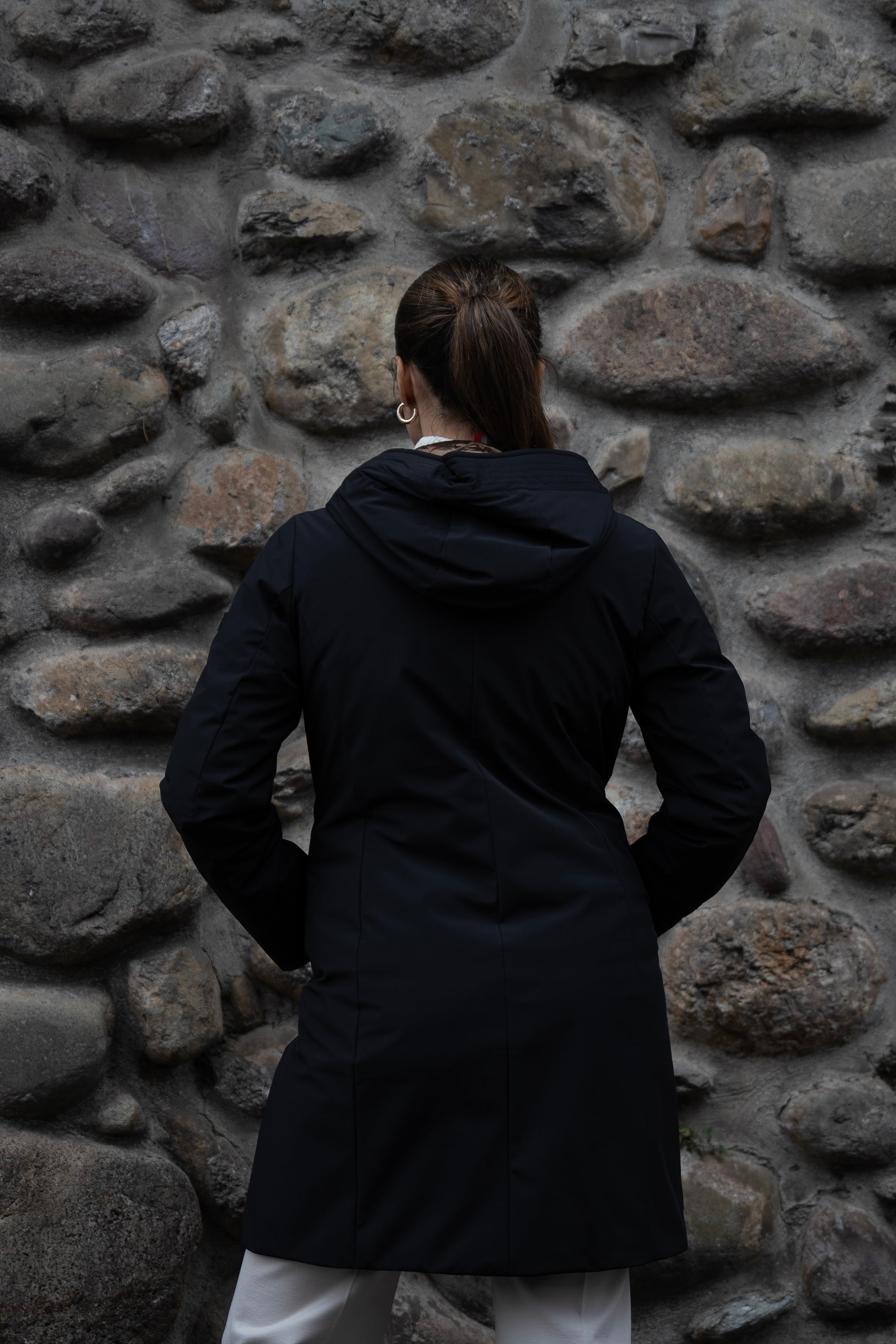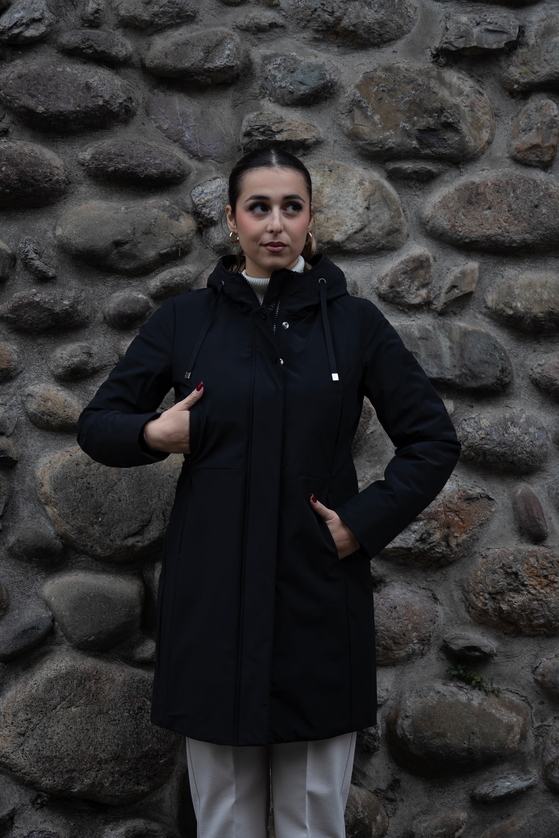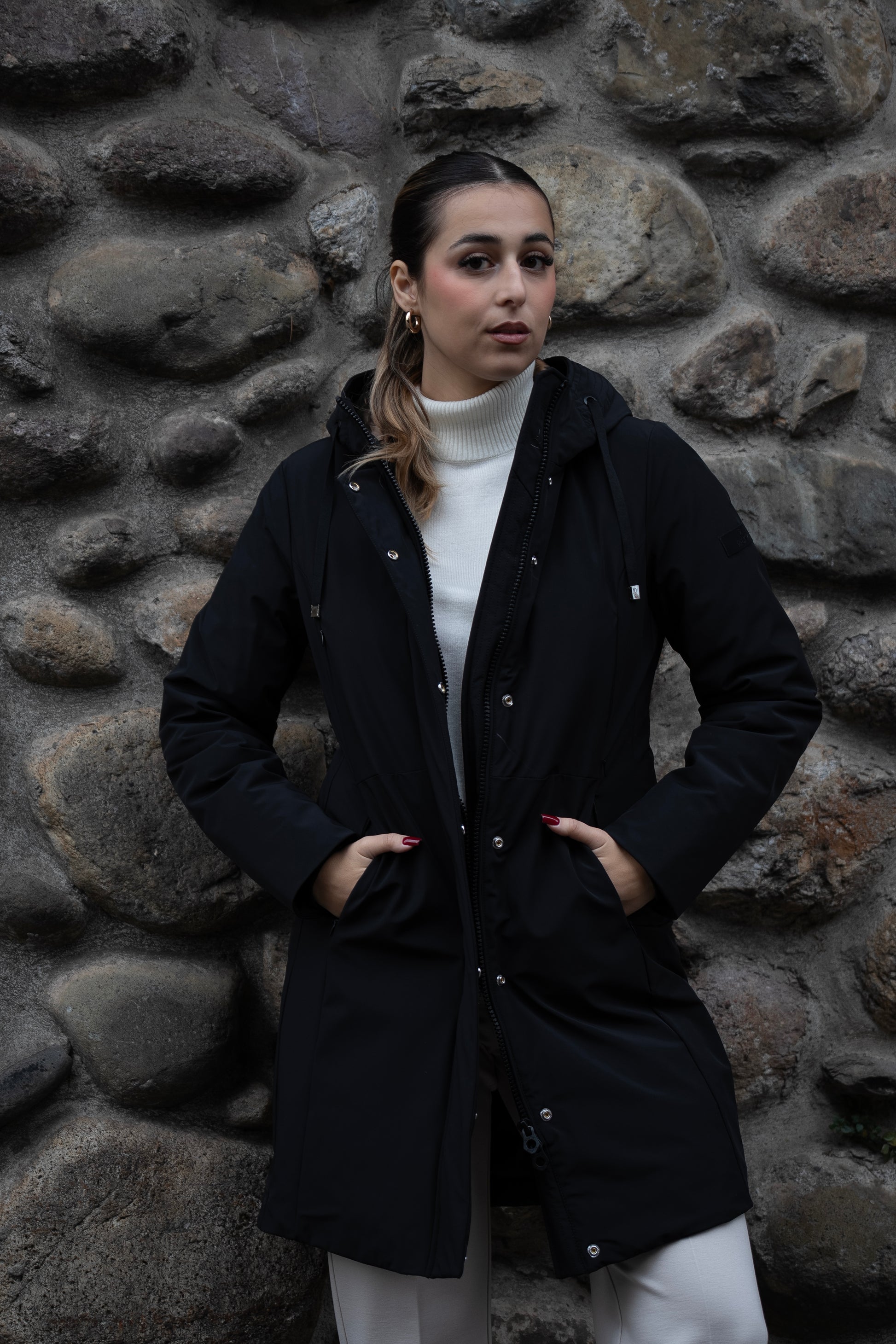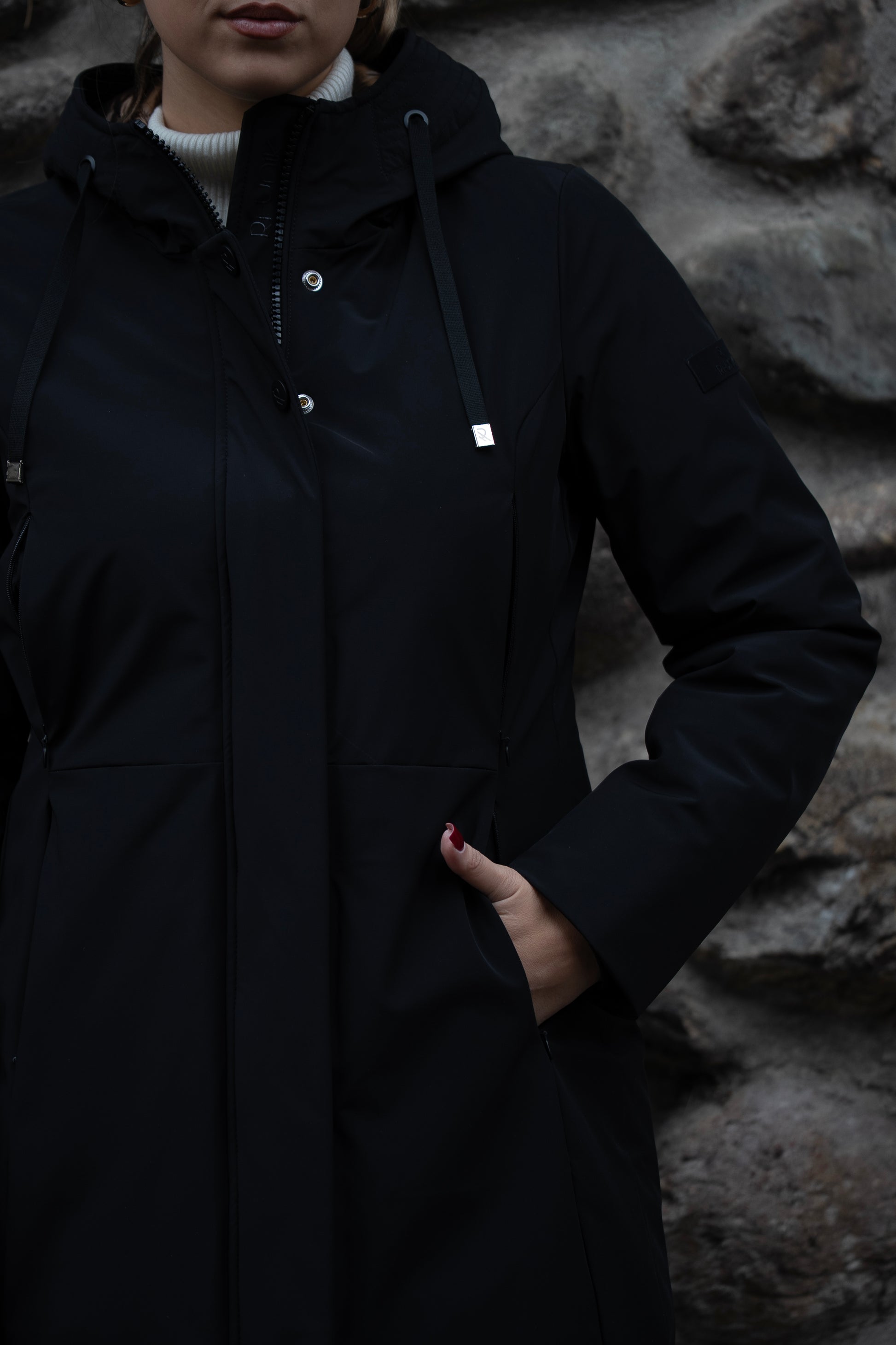 Capospalla liscio dal concept informale realizzato in nylon stretch opaco accoppiato. Cappuccio con orlo arricchito da impunture, fondo manica chiuso da polso interno in costina. Le 4 tasche con zip invisibili lo distinguono per la sua immagine pulita. Vestibilità asciutta e media lunghezza.