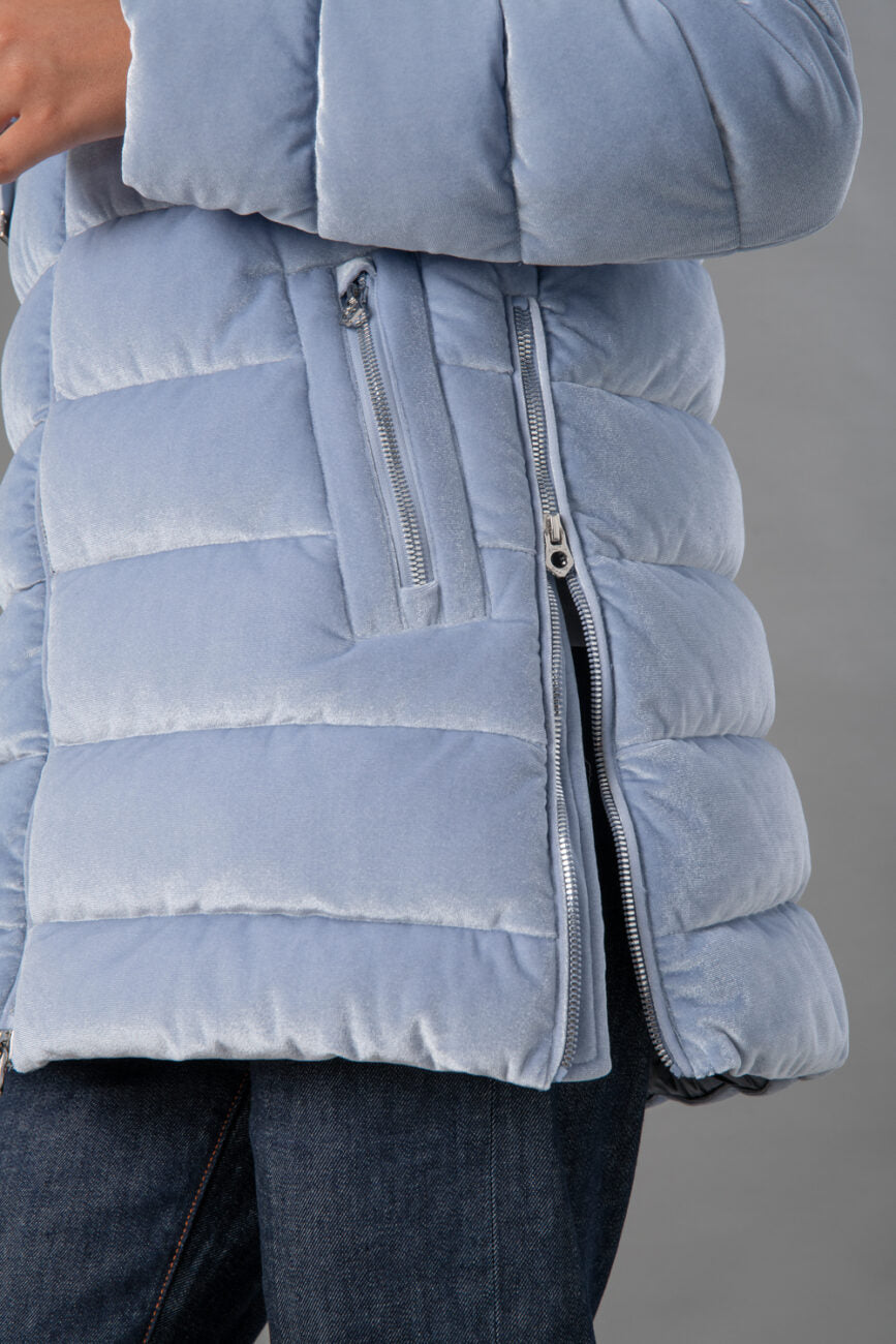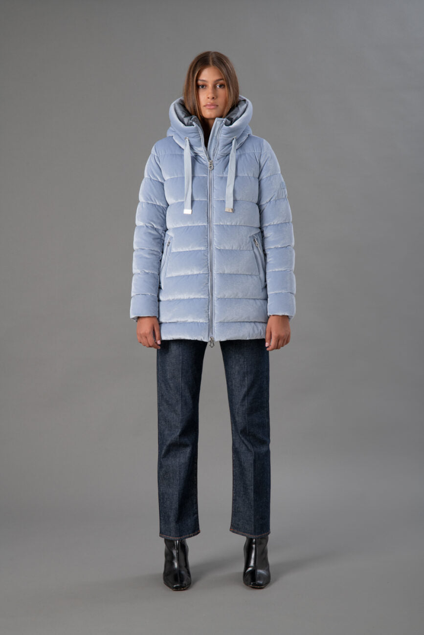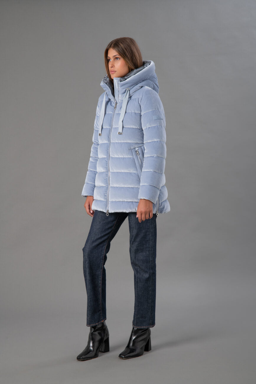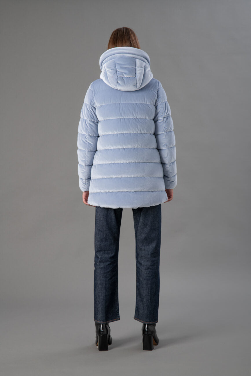 Capospalla di medio peso realizzato in un sofficissimo velluto lucido ed elastico, che esalta il senso di confortevolezza del capo. Cappuccio avvolgente in nylon cangiante tonale con doppio orlo,