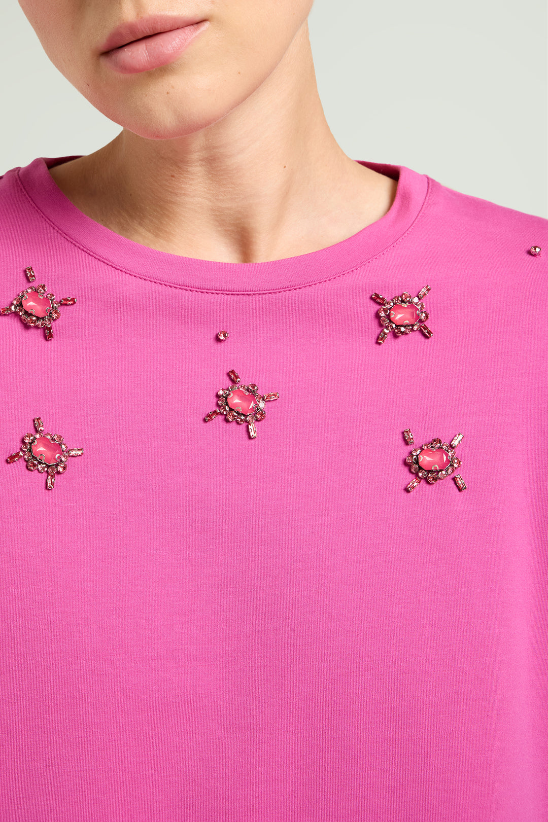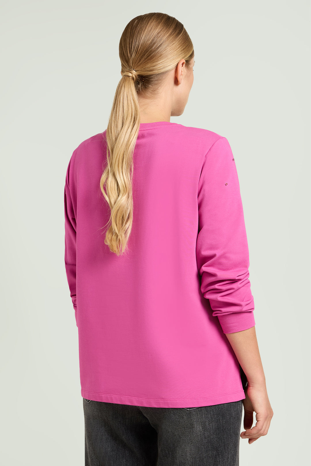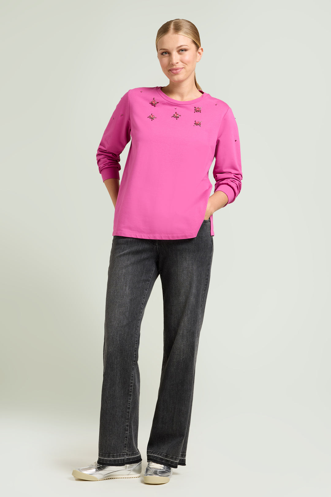 Felpa leggera di puro cotone stretch, caratterizzata da un prezioso ricamo. Linea boxy leggermente svasata con spacchi laterali, scollatura rotonda, maniche lunghe con polso.